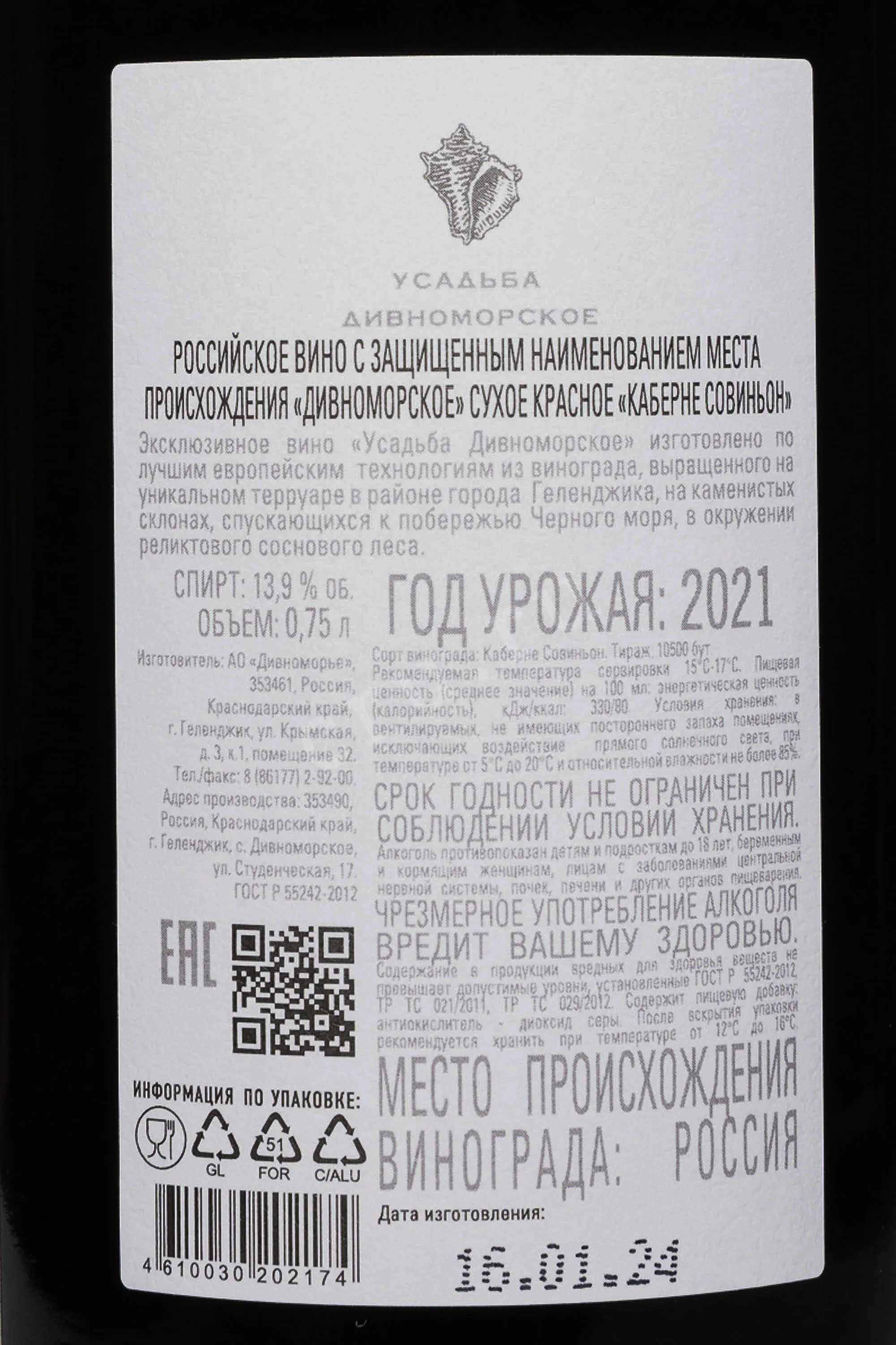 Каберне Совиньон Усадьба Дивноморское 2021 0.75