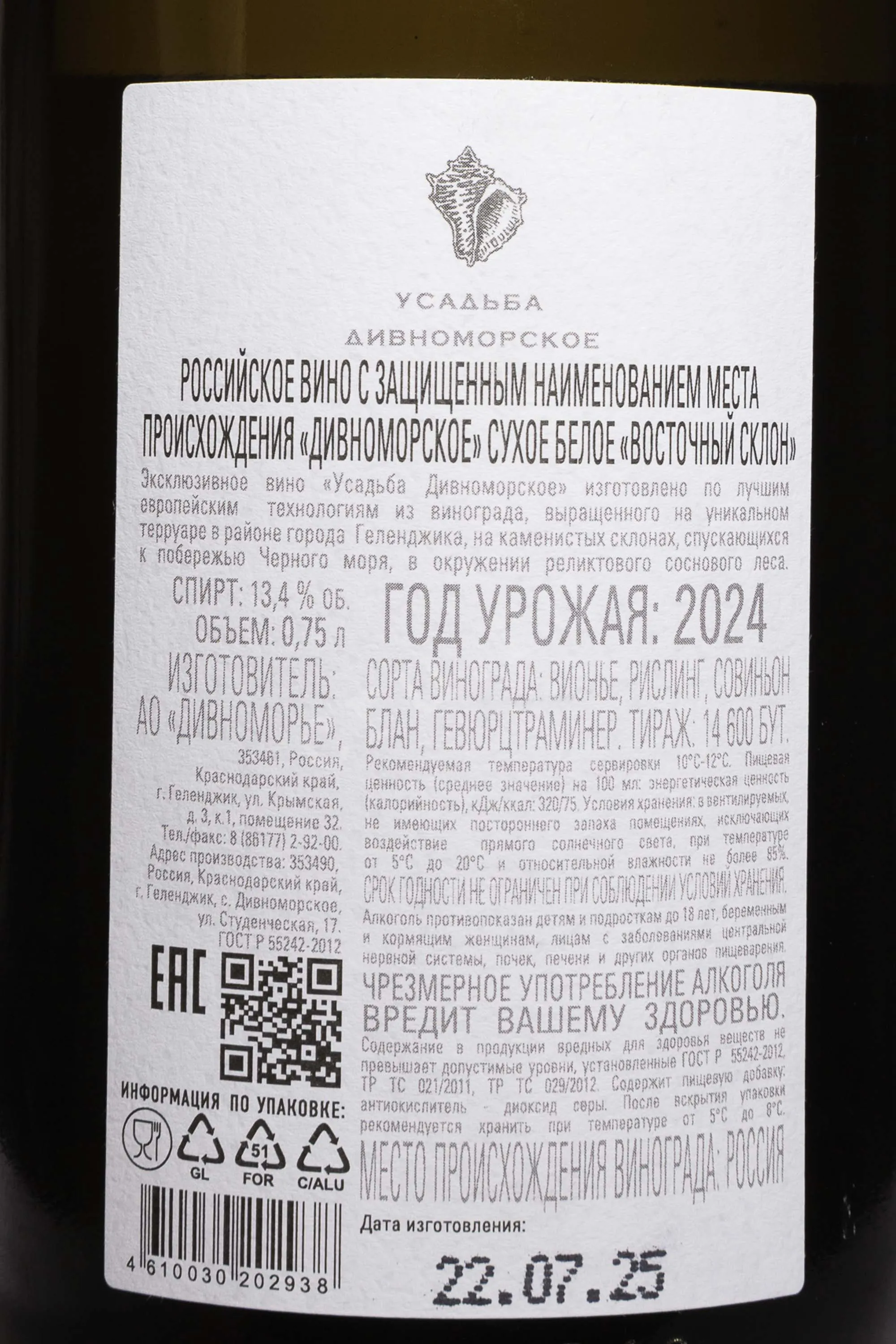 Белое сухое вино Усадьба Дивноморское Восточный Склон 2024 г. 0,75 л — миллезим с прибрежных участков Геленджикской бухты. Здесь лозы растут на склонах с выраженным уклоном к морю. В составе почв преобладают карбонаты и мергель, а бризы смягчают жару и сохраняют кислотность ягод. Урожай хорошо созрел, его собрали вручную рано утром и отправили в погреб, где сортировали и прессовали. Отжатый сок ферментировали современным способом в стальных резервуарах с контролем температуры.