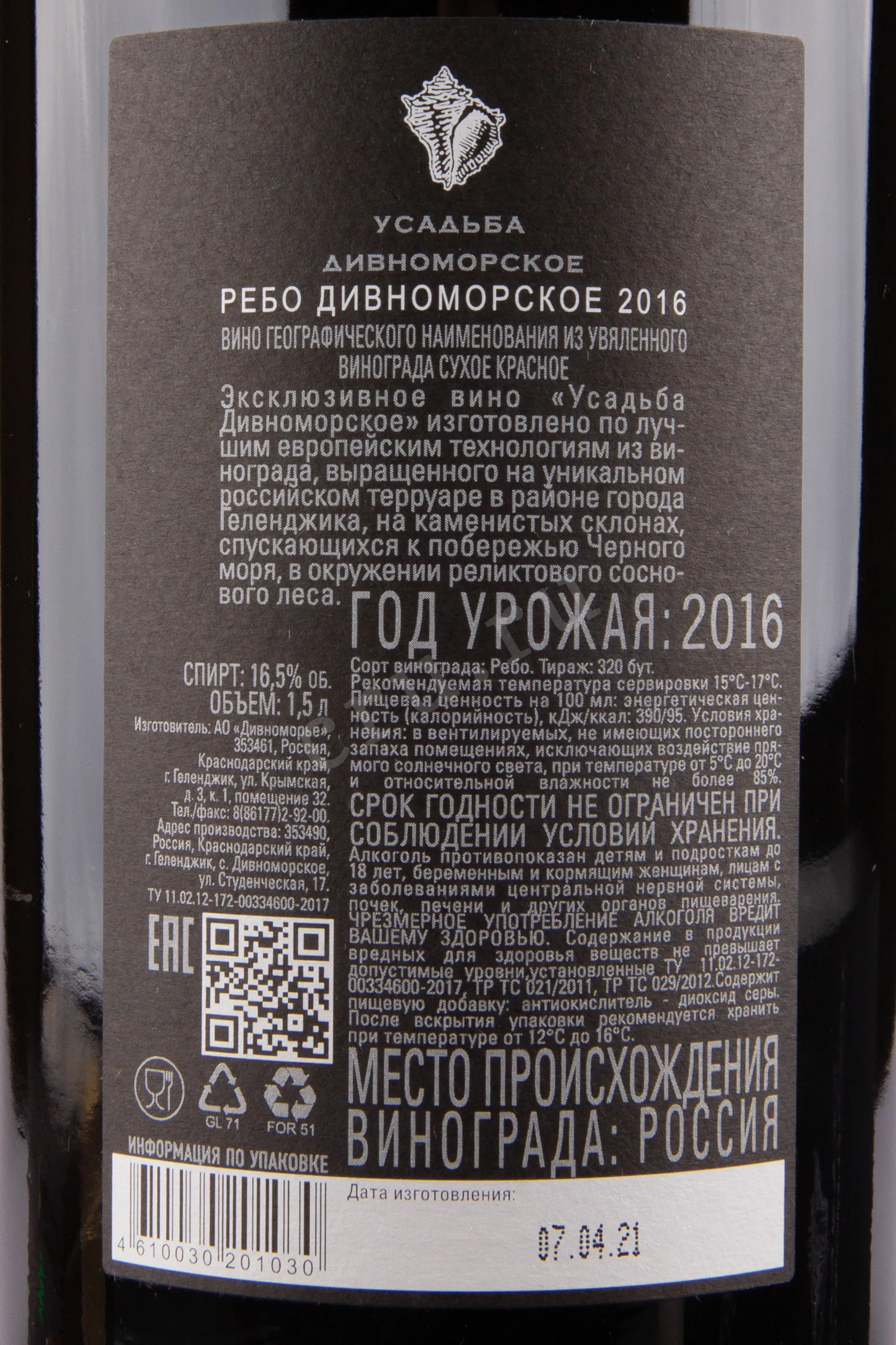 Вино Усадьба Дивноморское Ребо в подарочной упаковке 2016 1.5 л