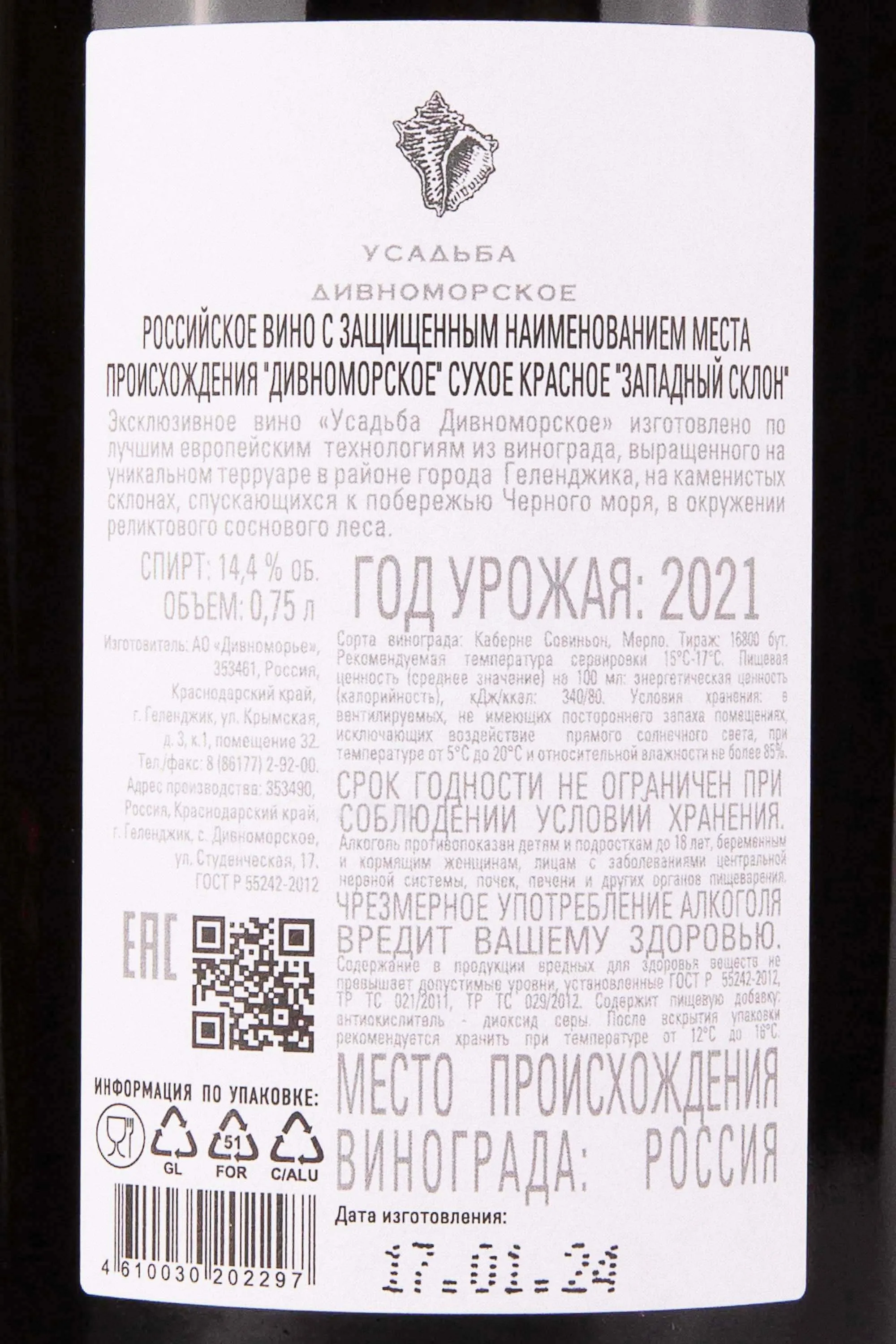 Вино Усадьба Дивноморское Западный Склон 2022 0.75 л