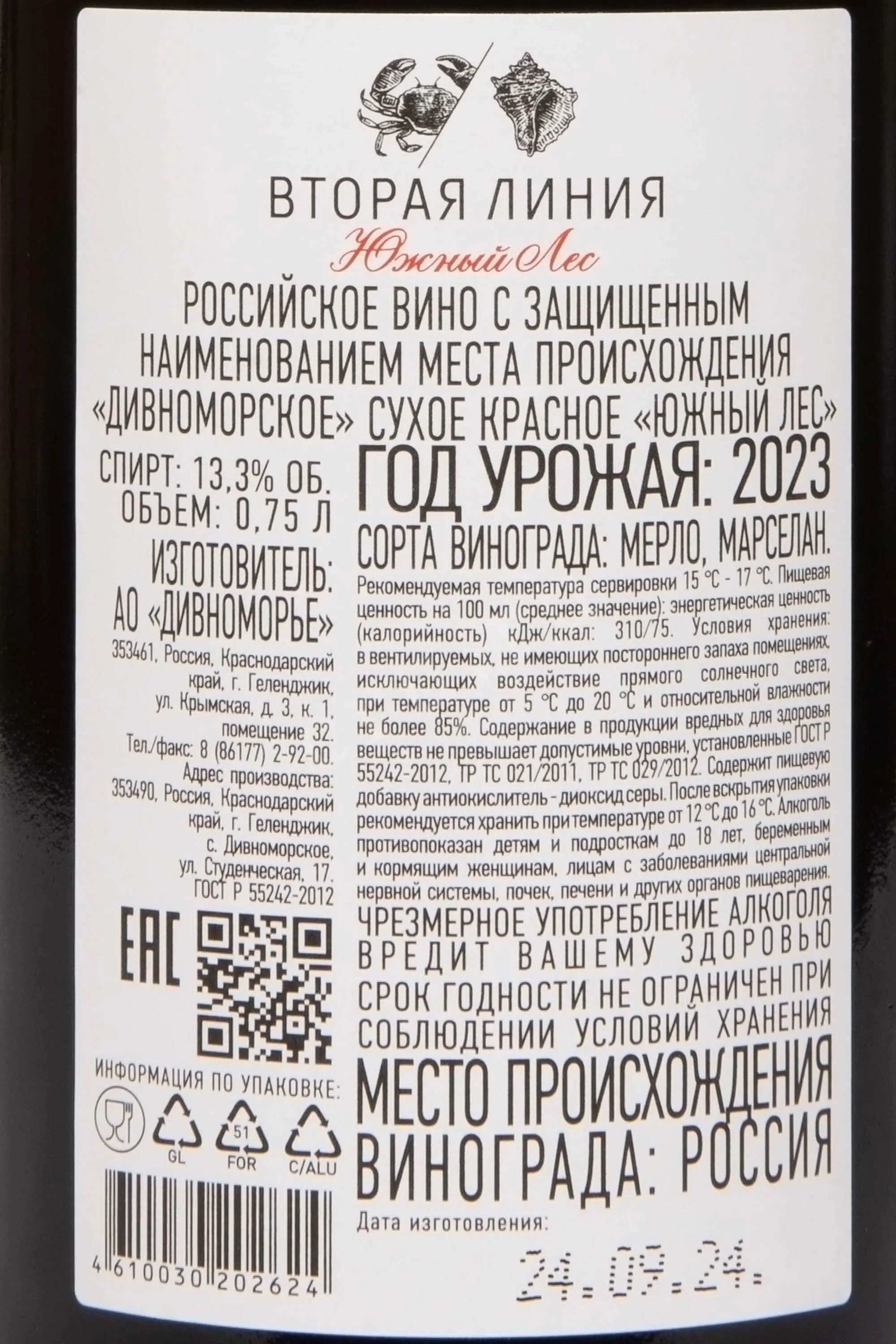 Вино Усадьба Дивноморское Южный Лес Вторая Линия 2024 0.75 л было создано на склонах Черноморского побережья Краснодарского края, где мягкий морской климат сочетался с известково-мергелевыми почвами и хорошей инсоляцией. Урожай собирался вручную в период оптимальной фенольной зрелости, что позволило сохранить баланс между сахаристостью и естественной кислотностью. На винодельне применялась деликатная сортировка ягод, холодная мацерация для извлечения ароматики и контролируемая ферментация при пониженных температурах. Часть партии выдерживалась в дубе средней обжарки, что добавило структуру тонкие пряные нюансы, не подавляя сортовой характер. Терруар Усадьбы Дивноморское с его бризами и перепадами дневных и ночных температур способствовал формированию концентрированного, но гармоничного профиля.
