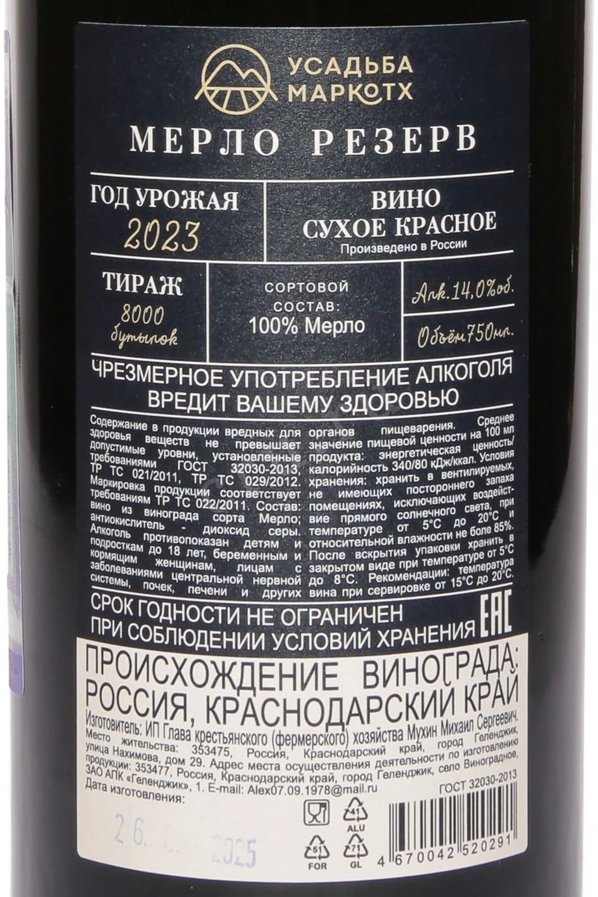 Красное сухое вино Усадьба Маркотх Мерло Резерв 2023 г. 0,75 л производится из винограда, выращенного в долинах и на склонах Маркотхских гор, расположенных недалеко от Черного моря. Почвы здесь известняково-глинистые, с достаточным количеством минералов и хорошим дренажом. Мягкий морской климат и постоянные бризы позволяют ягодам созревать равномерно. Сезон отличался обилием солнечных дней и умеренной засушливостью, что дало винограду насыщенность и баланс кислотности. Сбор сырья проводился вручную, чтобы сохранить качество гроздей. После ферментации напиток выдерживался в дубе, приобретая дополнительную глубину и элегантный характер.