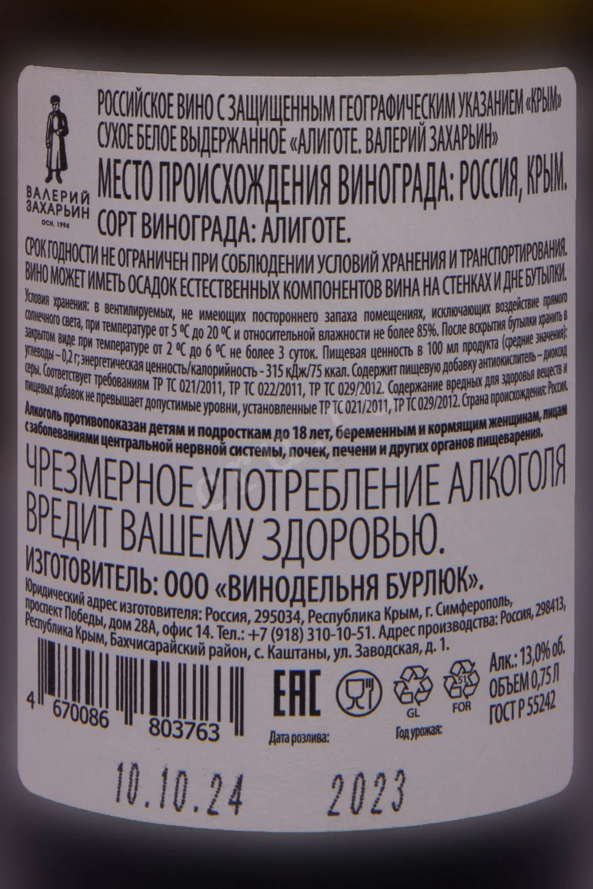 Валерий Захарьин Алиготе 2023 0.75 л купить - Российское вино Valery Zaharin Aligote цена в магазине КРЮ ПРОФИ г. Москва, ул. Профсоюзная, д. 16/10 10:00-22:00 Ежедневно +7 (495) 920-20-02 info@cru.ru
