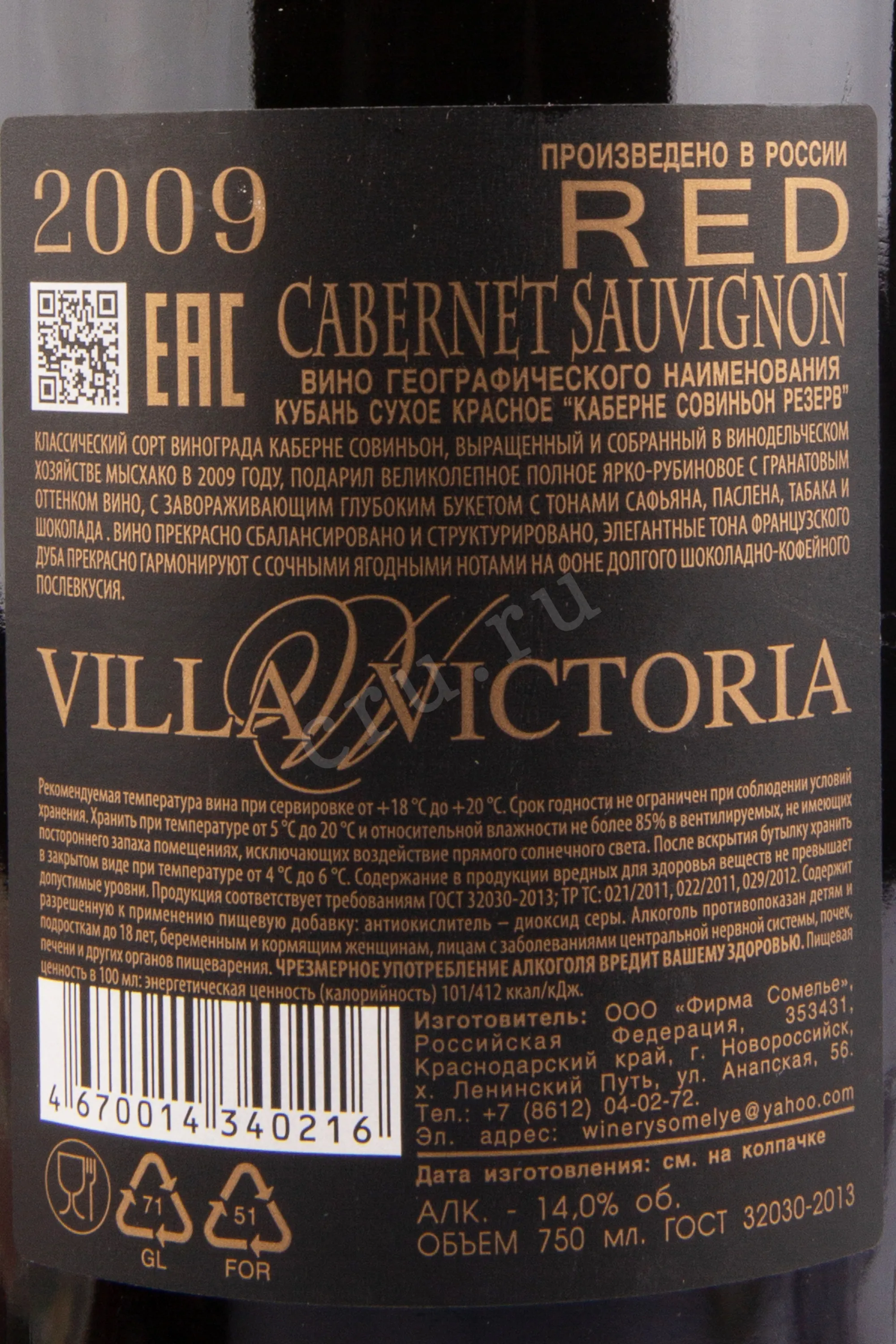 Вино Villa Victoria Cabernet Sauvignon Reserve Semigorye 2009 0.75 l – это российский алкоголь, произведенный на одном из известных винодельческих предприятий, расположенном Семигорье. 2009 год оказался удачным для винограда в этом регионе, что позволило создать напиток высокого качества. Красное сухое вино выполнено из сорта Каберне Совиньон, одного из самых популярных и признанных в мире. Данный релиз проходит процесс выдержки в бочках из кавказского дуба, что способствует глубине и сложности готового продукта. Розлив был осуществлен при крепости 14% в элегантные сосуды из темного стекла.