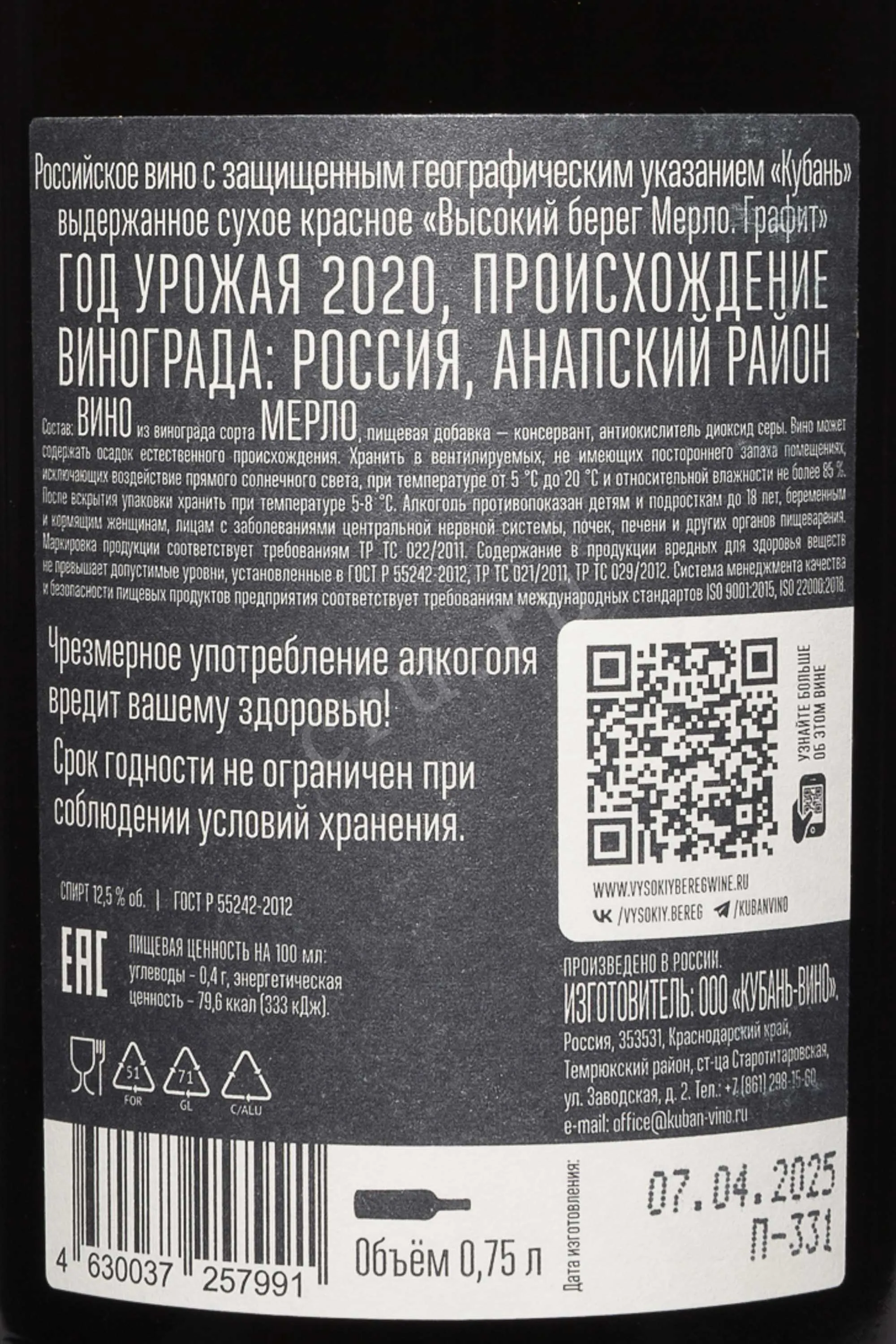 Красное сухое вино Высокий берег Мерло Графит 2020 года 0,75 л — выразительное, из лимитированной серии, созданной винодельней «Кубань-Вино» как воплощение современных технологий и классических традиций. Виноград сорта Мерло выращивается на виноградниках агрофирмы «Южная» на Таманском полуострове, где климат мягкий, с солнечным летом и прохладными ночами, что способствует равномерному созреванию ягод. Урожай 2020 года оказался особенно удачным: тёплая осень позволила достичь оптимального баланса сахаров и кислотности. После ручного сбора ягоды прошли классическую ферментацию с последующим яблочно-молочным брожением. Выдержка длилась 12 месяцев в бочках из французского и американского дуба, что придало вину глубину и сложность букета. Серия «Графит» считается экспериментальной и отражает рост мастерства российских виноделов, объединяя инновации и европейский стиль.