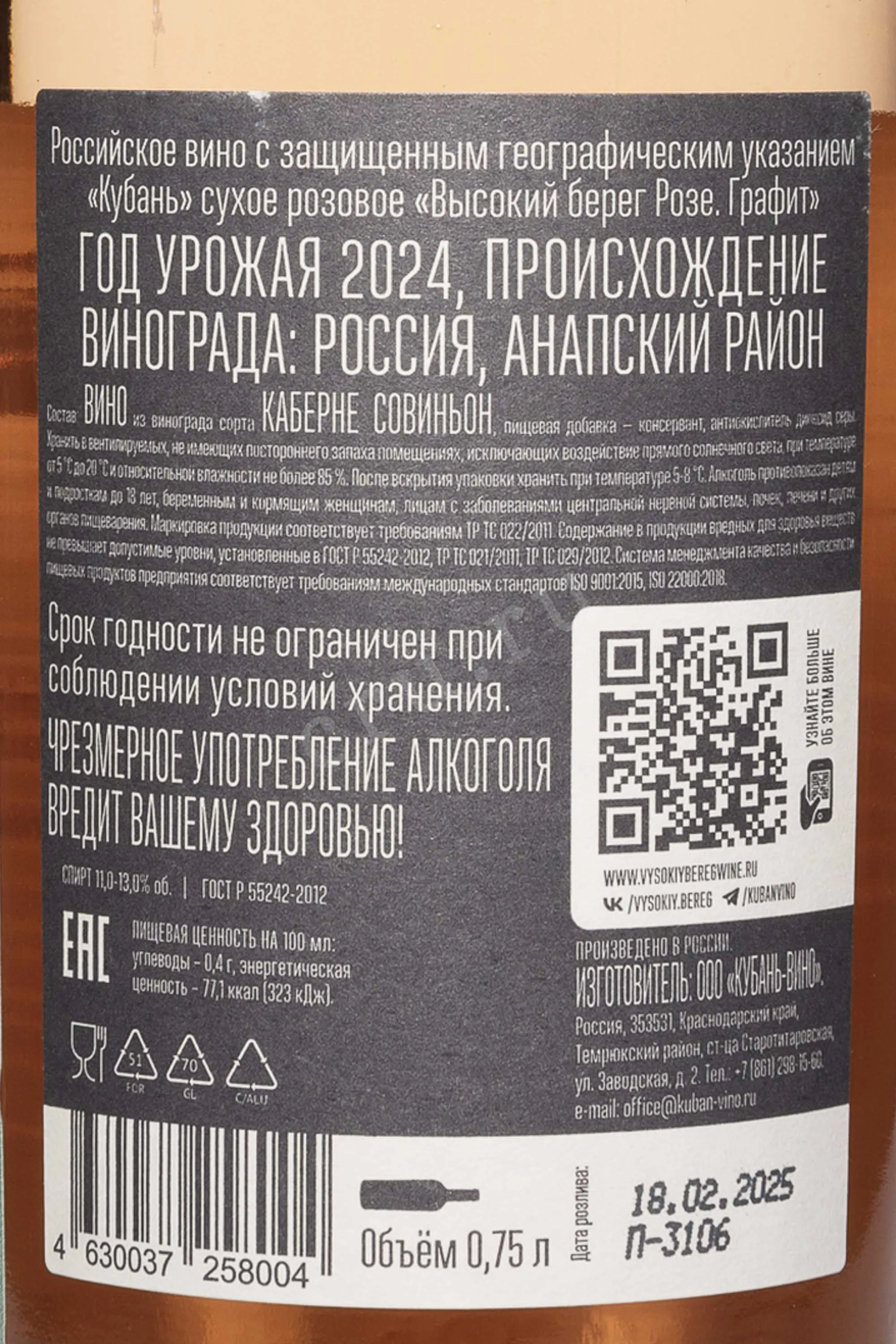 Розовое сухое вино Высокий берег Розе Графит 2024 года 0,75 л создано в изящной стилистике Прованса, где главная идея — лёгкость и гармония. Виноград Каберне Совиньон выращен в терруаре ЗГУ «Кубань», отличающемся солнечным и мягким черноморским климатом. Урожай 2024 года оказался удачным: лето было тёплым, без излишней жары, что позволило ягодам сохранить аромат и кислотность. При производстве виноград перерабатывали без контакта с кожицей, чтобы получить деликатный оттенок. Ферментация проходила при контролируемой температуре 16–18 °C, после чего вино выдерживалось на тонком дрожжевом осадке 6 месяцев с батонажем. Тираж составил 25 000 бутылок. Розе Графит ценят за чистоту вкуса и французскую элегантность. Оно получило положительные отзывы за точность стиля и сбалансированное послевкусие.