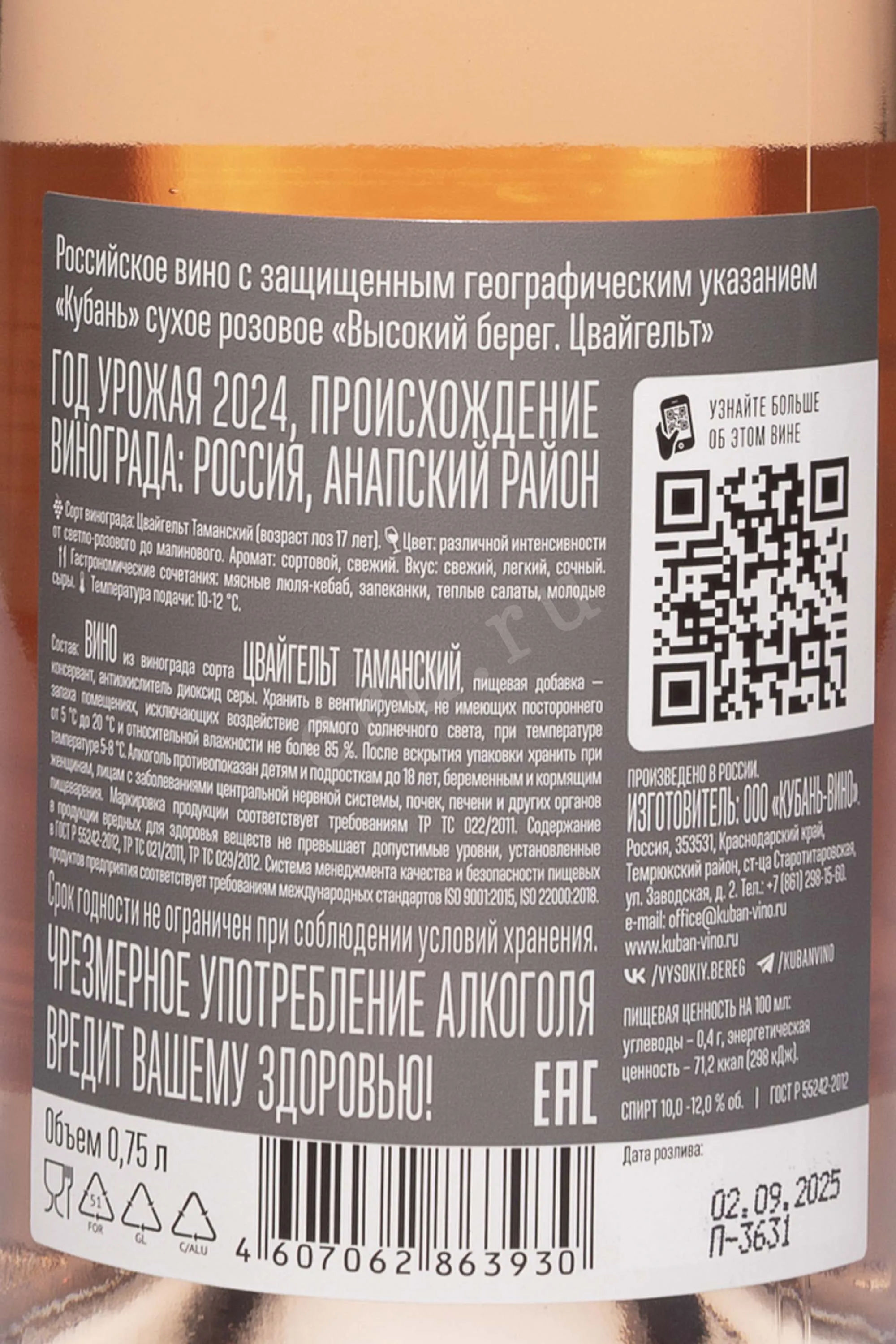 Розовое сухое вино Высокий берег Цвайгельт 2024 года 0,75 л создано из отборного винограда одного сорта, выращиваемого в терруаре Анапского района, где мягкий климат и морской бриз способствуют равномерному созреванию ягод. 2024 год был стабильным в плане погоды и благоприятным для виноделов, с теплым летом без засухи и резких перепадов температур. Лозы возрастом около 17 лет дали концентрированные ягоды с ярким ароматом и сбалансированной кислотностью. Ферментация проходила по оригинальной технологии, с контролем температуры, что позволило сохранить свежесть и чистоту вкуса. Производство основано на принципах «изящной классики»: сочетание традиционных методов и современных подходов подчёркивает индивидуальность сорта. Это вино выделяется своей гастрономичностью и чистым, выразительным стилем, характерным для линейки «Высокий Берег», которая получила признание среди экспертов за гармонию вкуса и технологическую точность.