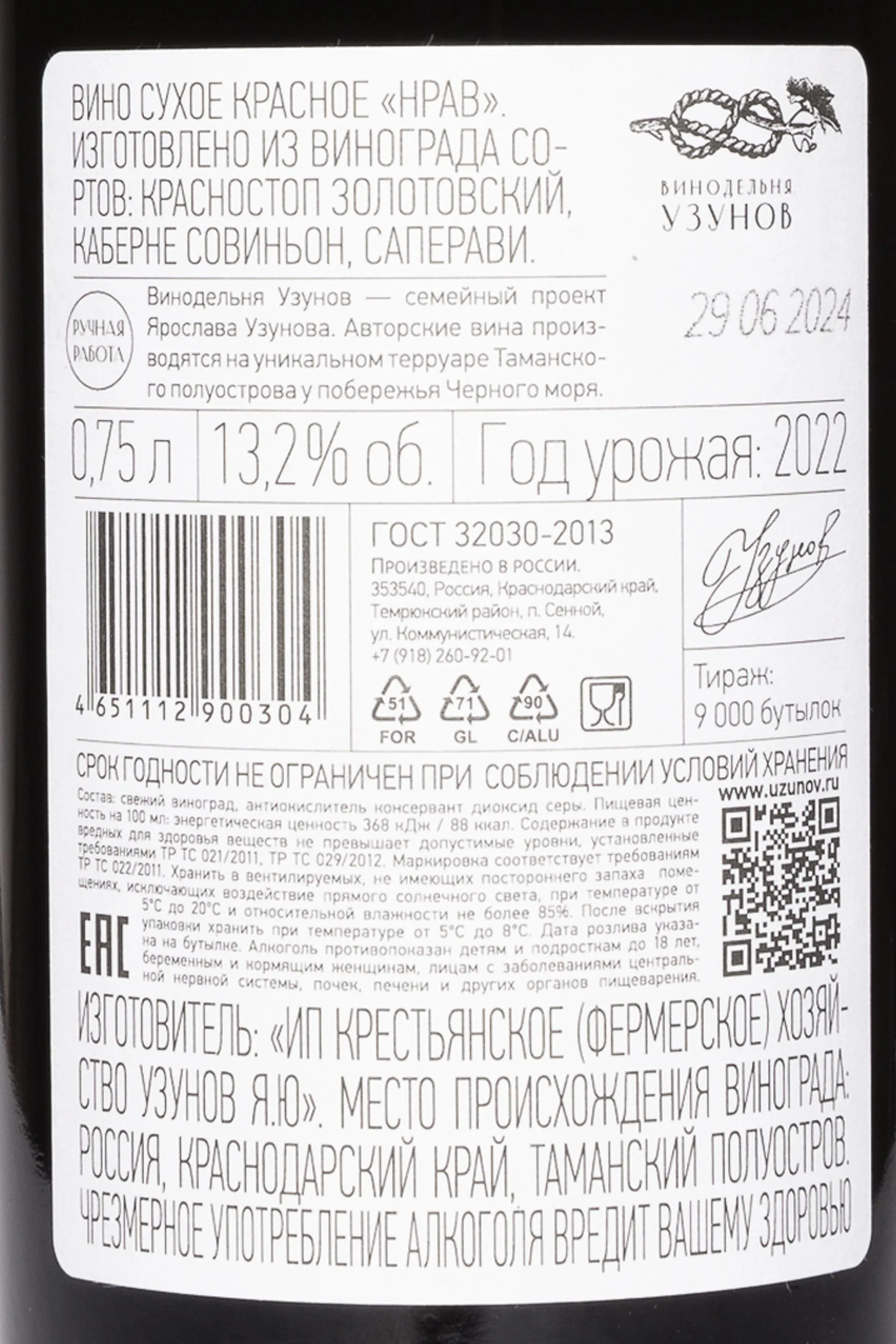 Красное сухое вино Винодельня Узунов Нрав 2022 года 0,75 л создано из трёх ярких сортов — Красностопа Золотовского, Каберне Совиньона и Саперави. Этот выразительный и многослойный бленд отражает характер южного терруара, где виноградники разбиты на холмистых склонах с чернозёмными почвами в зоне умеренно континентального климата. Близость Азовского и Чёрного морей способствует формированию у вина минеральности и особой свежести. Урожай 2022 года оказался удачным: тёплое лето и мягкая осень позволили ягодам достичь идеальной зрелости. Процесс производства базировался на принципе минимального вмешательства. Виноград собирали ручным способом, сорта ферментировали отдельно в стальных ёмкостях. Вино выдерживали 12 месяцев в бочках из кавказского и французского дуба, что обеспечило ему гармоничность и благородство характера.