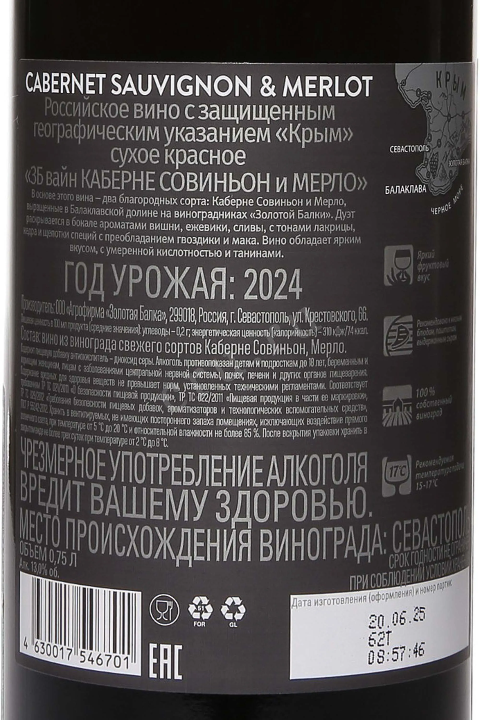 Красное сухое вино ZB Wine Cabernet Sauvignon & Merlot 2024 г. 0,75 л создано в условиях мягкого климата Черноморского побережья. Виноградники расположены на южных склонах с известняковыми и глинистыми почвами, которые обеспечивают гармоничное развитие лозы. Солнечное лето винтажа сопровождалось умеренными дождями в июне и сухим августом, что позволило ягодам набрать концентрированную сладость и сохранить кислотность. Урожай собрали вручную, что гарантировало отбор только целых и спелых гроздей. После мягкого прессования сусло выдерживалось в стальных емкостях с контролем температуры. В результате получился напиток с плотной структурой, где два классических сорта дополнили друг друга, привнеся четкие танины и глубину с одной стороны и мягкость с фруктовой насыщенностью — с другой.