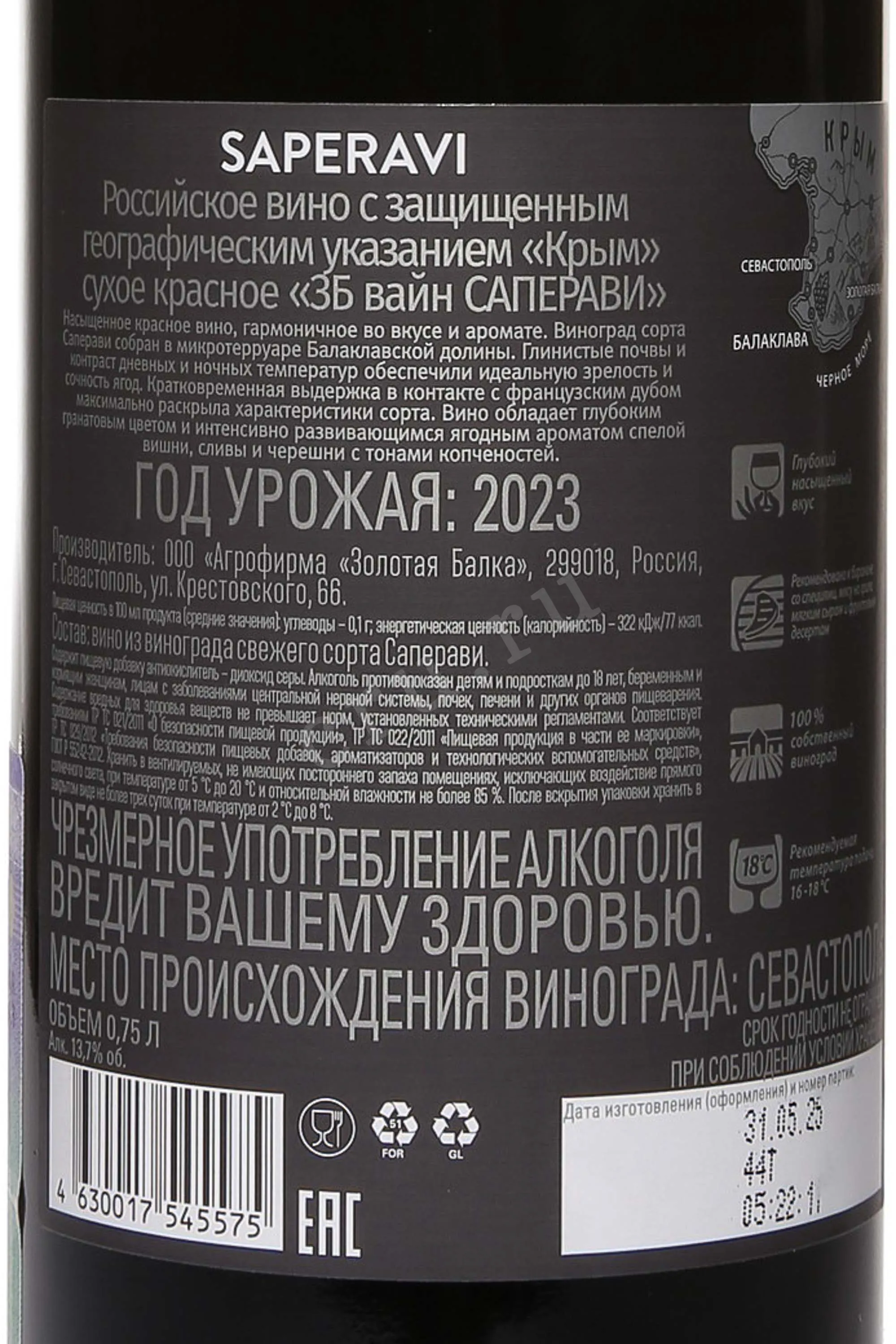 Красное сухое вино ЗБ Вайн Саперави 2023 г. 0,75 л создано из урожая, собранного на склонах Крыма. Виноградники расположены в зонах с каменистыми и известковыми почвами, что дает сырью высокую концентрацию танинов и яркий цвет. Год выдался теплым и сухим, с небольшим количеством осадков в июле и августе, благодаря чему плоды набрали достаточный уровень сахара при сохранении кислотности. Образец произведен по классической технологии с контролем температуры брожения, что позволяет сохранить сортовой характер.