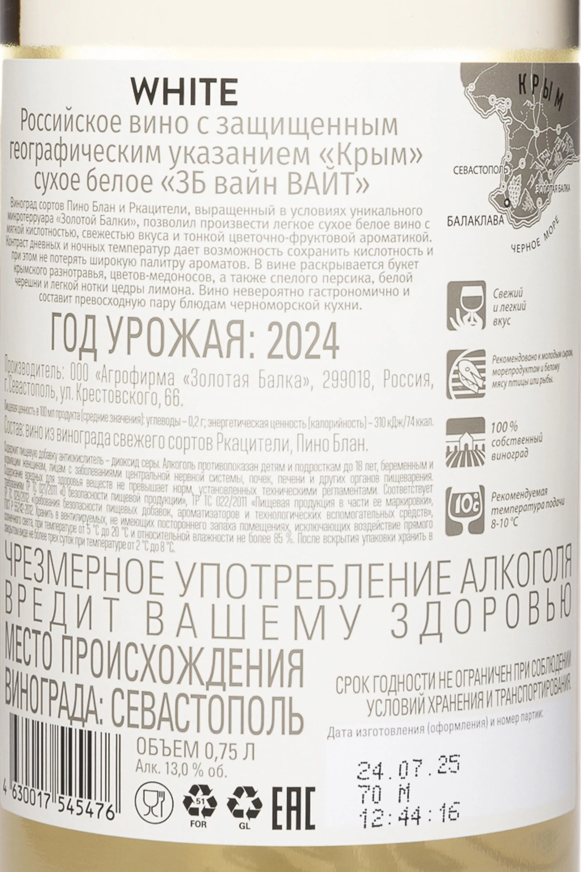 Белое сухое вино ЗБ Вайн Вайт 2024 года 0,75 л создано из двух сортов винограда, выращенного в живописной Балаклавской долине Крыма. Здесь карбонатные, глинисто-известняковые почвы и мягкий морской климат формируют особый стиль вин, сочетающий свежесть и выразительность аромата. 2024 год отличился стабильной погодой без избытка осадков, что позволило ягодам медленно и равномерно созревать. Этот баланс влаги и тепла напомнил экспертам о лучших терруарах Долины Роны и Бордо. Производство вина проходит под руководством французских и итальянских консультантов, включая Антуана Бастида — потомственного винодела с огромным практическим опытом. Виноград собирают вручную в небольшие корзины, чтобы сохранить целостность ягод. После мягкого прессования сусло ферментируется при контролируемой температуре 15-16 °C в емкостях из нержавеющей стали. Вино отличается чистотой вкуса и ярким отражением крымского солнца. Коллекция ZB Wine не раз получала золотые медали, начиная с выставки «Золотой Грифон-2017».