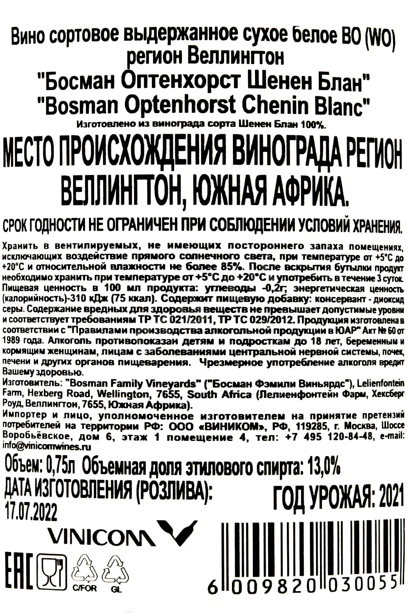 Bosman Optenhorst Chenen Blanc 0.75 л купить - Южноафриканское вино Босман Оптенхорст Шенен Блан цена в магазине г. Москва, ул. Профсоюзная, д. 16/10 10:00-22:00 Ежедневно +7 (495) 920-20-02 info@cru.ru