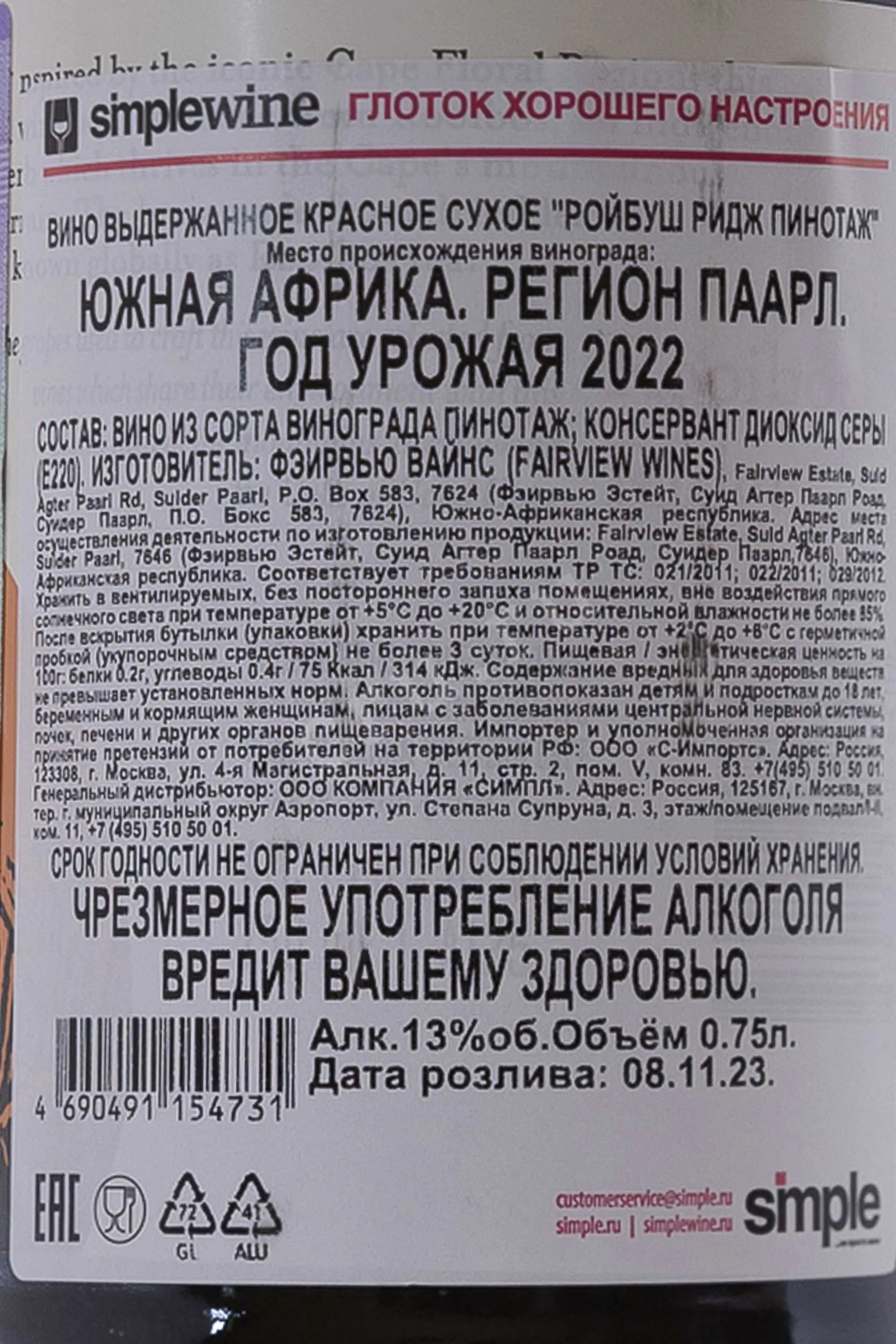 Красное полусухое вино Rooibos Ridge Pinotage — это яркий представитель виноделия ЮАР от знаменитого хозяйства Fairview. Название «Ройбуш Ридж» отсылает к уникальному африканскому растению ройбуш («красный куст»), чьи деликатные травянистые и ягодные нюансы находят отражение в характере напитка. Вино создается из флагманского южноафриканского сорта Пинотаж, выращенного на солнечных склонах Западного Кейпа. Процесс производства включает тщательную сортировку ягод, мацерацию и ферментацию в течение 10 суток при строго контролируемой температуре. Это позволяет сохранить сочность фруктов и придать вину округлую, бархатистую структуру. Rooibos Ridge Pinotage воплощает в себе инновационный дух винодельни и аутентичный терруар региона, предлагая гармоничное сочетание классической мощи красных вин Южной Африки и современной элегантности.