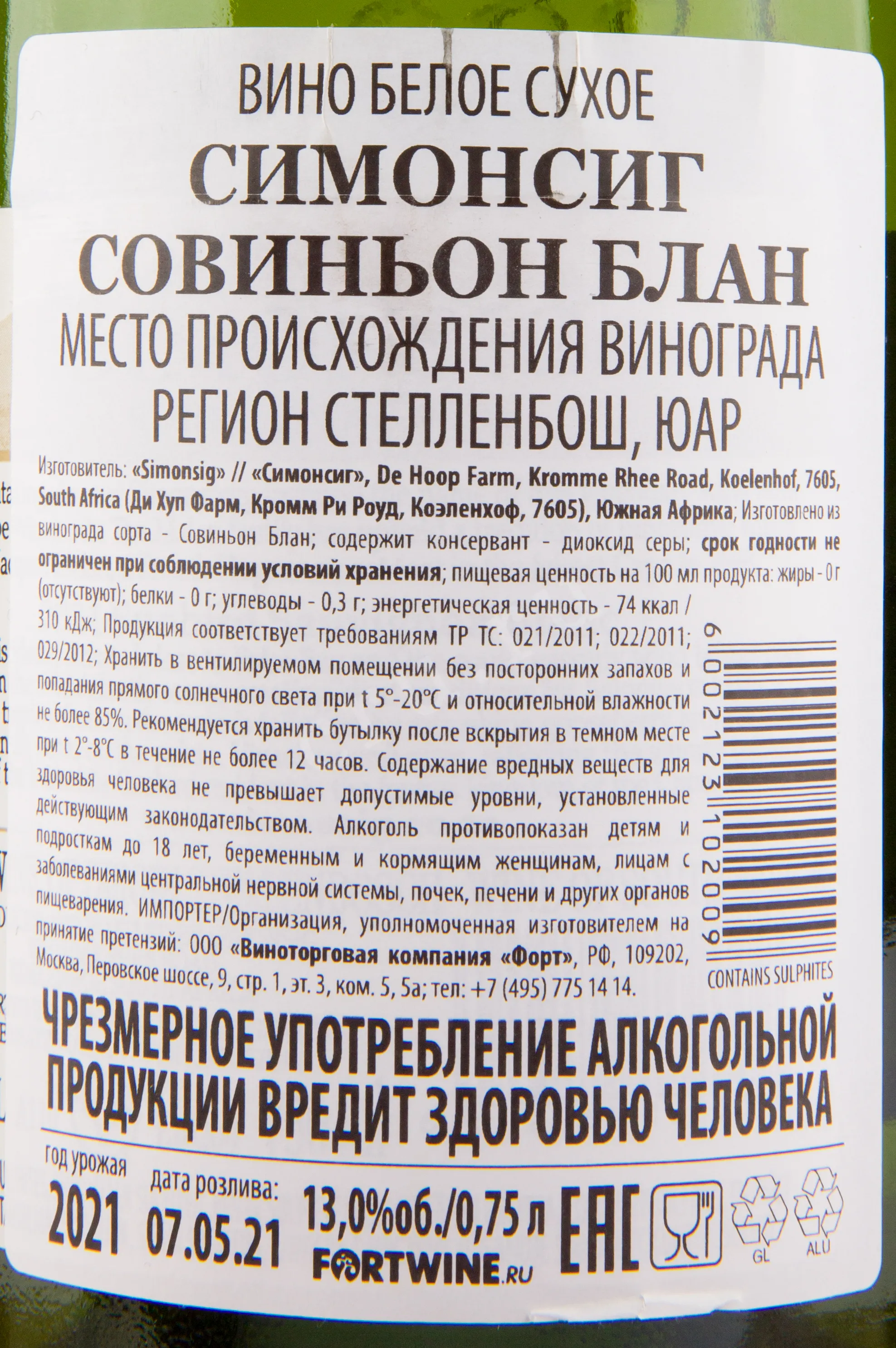 Simonsig Sauvignon Blanc 0.75 л купить - Южноафриканское вино Симонсиг Совиньон Блан цена в магазинег. Москва, ул. Профсоюзная, д. 16/1010:00-22:00 Ежедневно+7 (495) 920-20-02info@cru.ru
