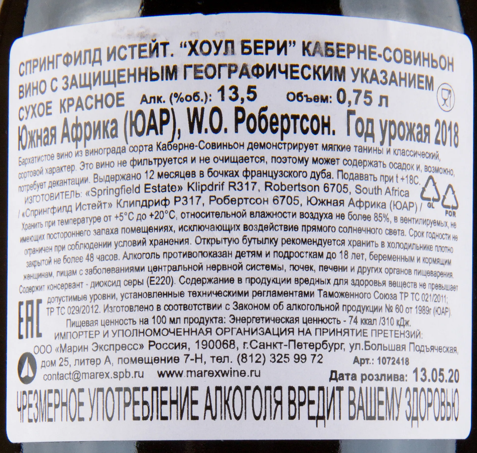 Springfield Estate Whole Berry Cabernet Sauvignon 2019 0.75 л купить - Южноафриканское вино Спрингфилд Истейт Хоул Берри Каберне Совиньон цена в магазине г. Москва, ул. Профсоюзная, д. 16/10 10:00-22:00 Ежедневно +7 (495) 920-20-02 info@cru.ru