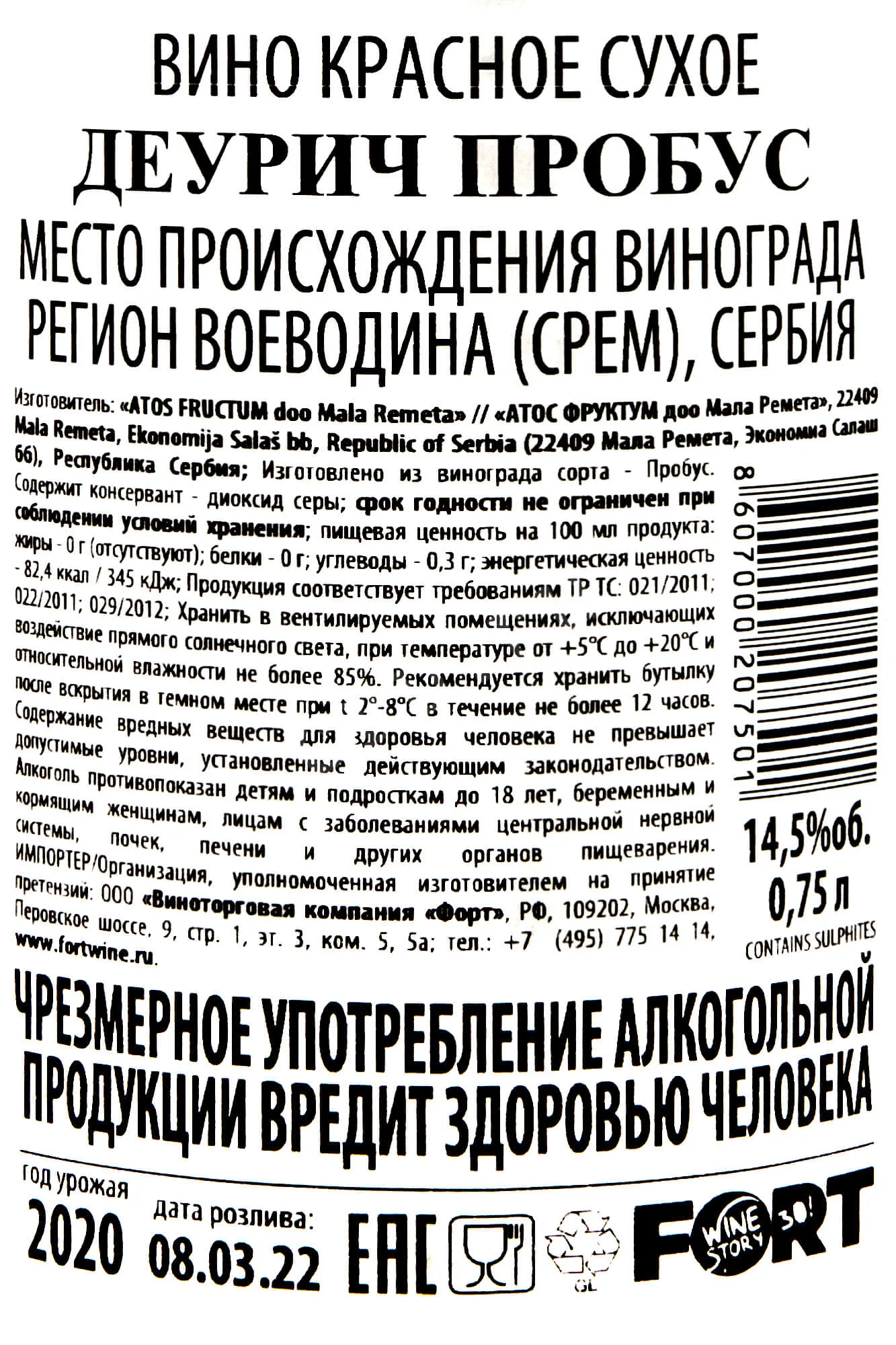 Deuric Probus 0.75 л купить - Сербское вино Деурич Пробус цена в магазине