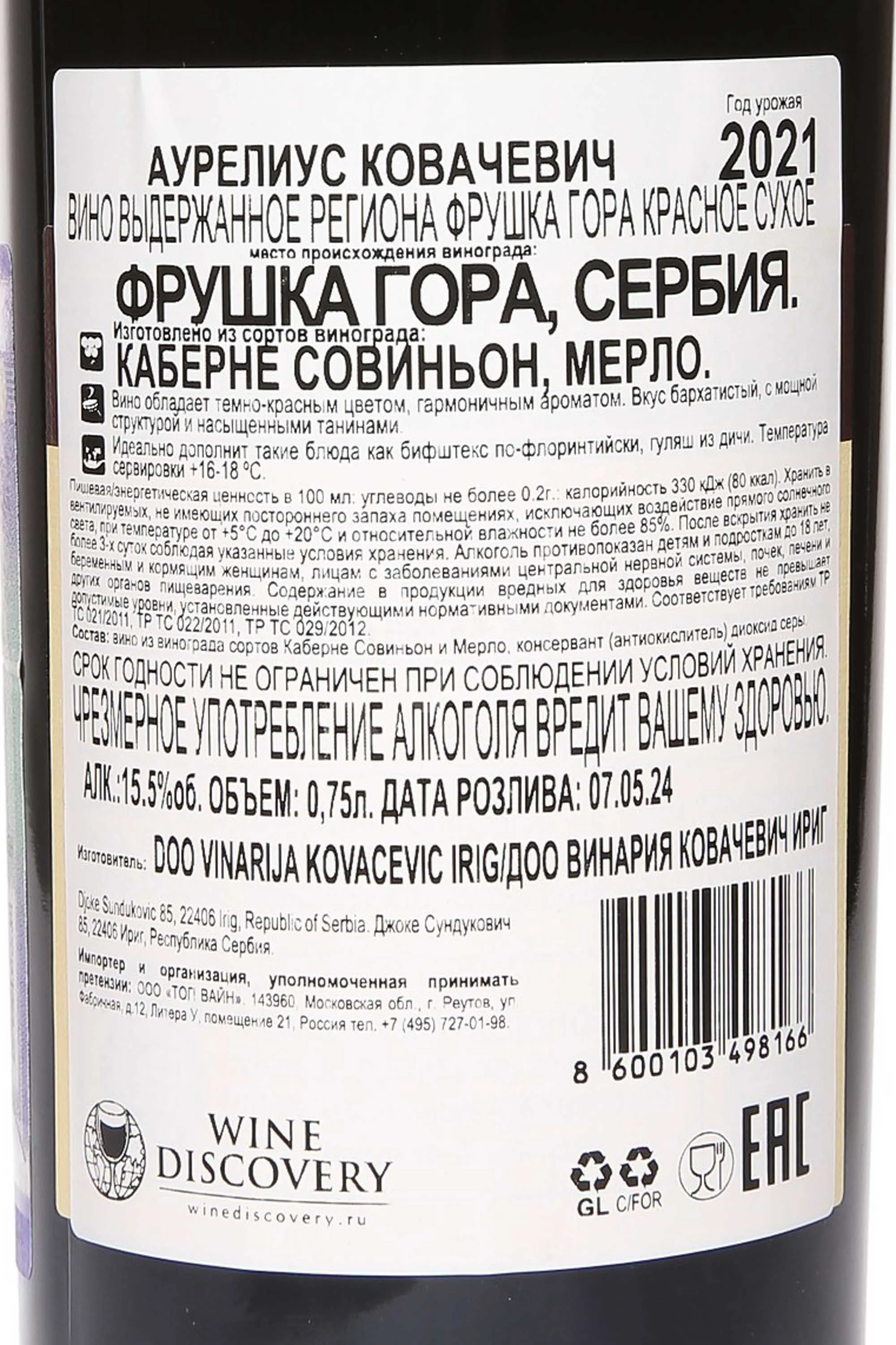 Красное сухое вино Kovaсeviс Aurelius 2021 года 0,75 л создано в традиционном стиле сербского виноделия с применением биодинамических техник. Виноград был выращен в регионе Фрушка-Гора, где почвы богаты минералами, а мягкий климат с большим количеством солнечных дней способствует равномерному созреванию ягод. Урожай 2021 года оказался удачным: лето было теплым, без резких перепадов температуры, что позволило получить спелые и концентрированные плоды. Ферментация проходила в контролируемых условиях с сохранением натурального аромата сорта, после чего вино выдерживалось 12 месяцев в дубовых бочках и затем еще в бутылках, что придало ему глубину и сложный характер. Оно отмечено критиками за изящный баланс свежести и насыщенности, а также включалось в авторитетные рейтинги региональных вин.