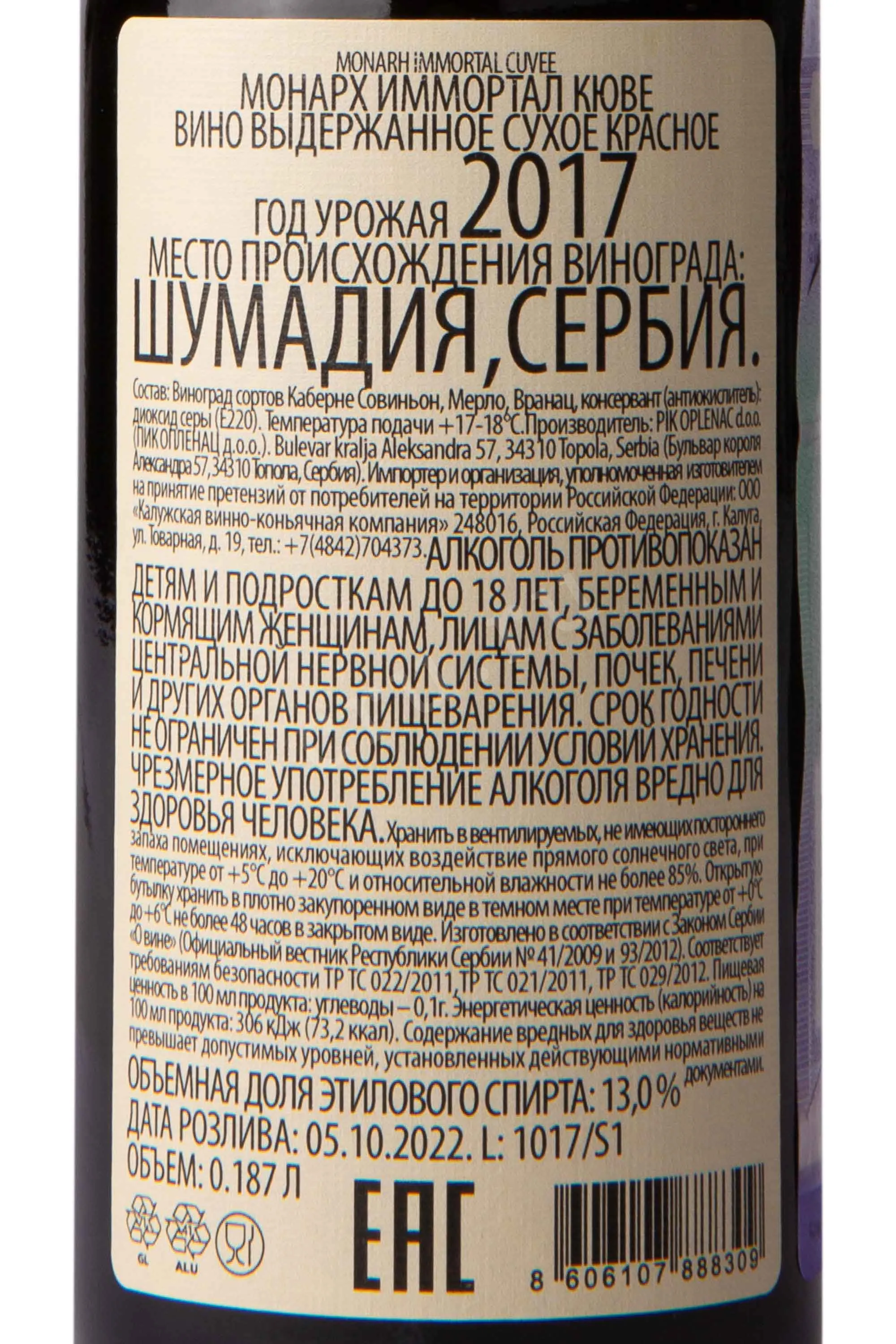 Monarh Immortal Cuvee 0.187 л купить - Сербское вино Монарх Иммортал Кюве цена в магазине г. Москва, ул. Профсоюзная, д. 16/10 10:00-22:00 Ежедневно +7 (495) 920-20-02 info@cru.ru