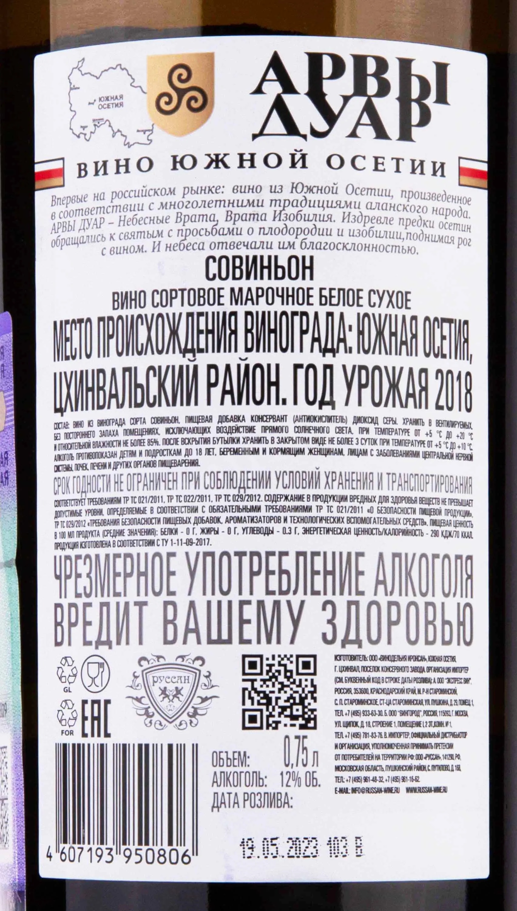 Arves Duar Sauvignon 0.75 л купить - Южноосетинское вино Арвы Дуар Совиньон цена в магазине г. Москва, ул. Профсоюзная, д. 16/10 10:00-22:00 Ежедневно +7 (495) 920-20-02 info@cru.ru