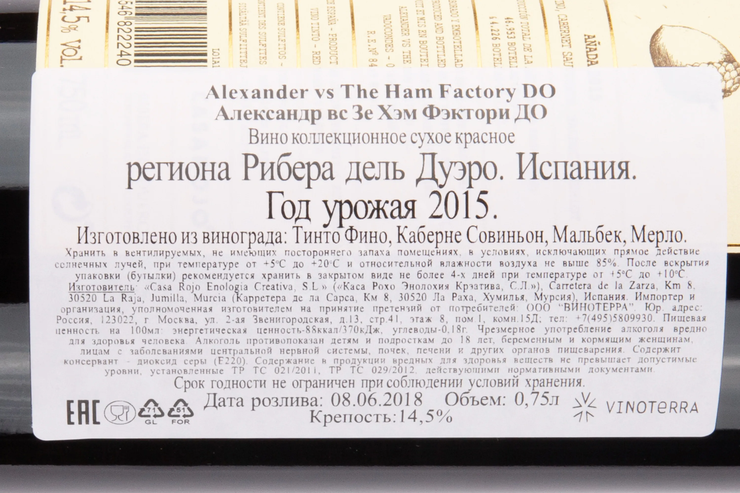 Красное сухое вино Alexander vs The Ham Factory Tinto Fino Crianza 2015 года 0,75 л — насыщенное, полнотелое, отражающее характер терруара Рибера дель Дуэро. Урожай 2015 года считается удачным: жаркое лето и прохладные ночи помогли винограду достичь оптимальной зрелости при сохранении свежести. Вино изготовлено из четырех сортов — Тинто Фино, Мальбек, Мерло и Каберне Совиньон. Лозы, возраст которых достигает 25-30 лет, растут на высоте около 900 метров над уровнем моря на известняково-глинистых почвах. Урожай собирают вручную в октябре ранним утром, что позволяет сохранить качество ягод. После двойного отбора виноград отправляется на ферментацию в стальные резервуары самотеком, без лишнего давления. Выдержка длится 18 месяцев в новых французских дубовых бочках, после чего вино отдыхает в бутылках еще полгода. Ограниченная урожайность обеспечивает концентрированный вкус, а потенциал выдержки превышает 10 лет. Винтаж 2015 года получил 90/100 от Falstaff Magazine («Восхитительный»).