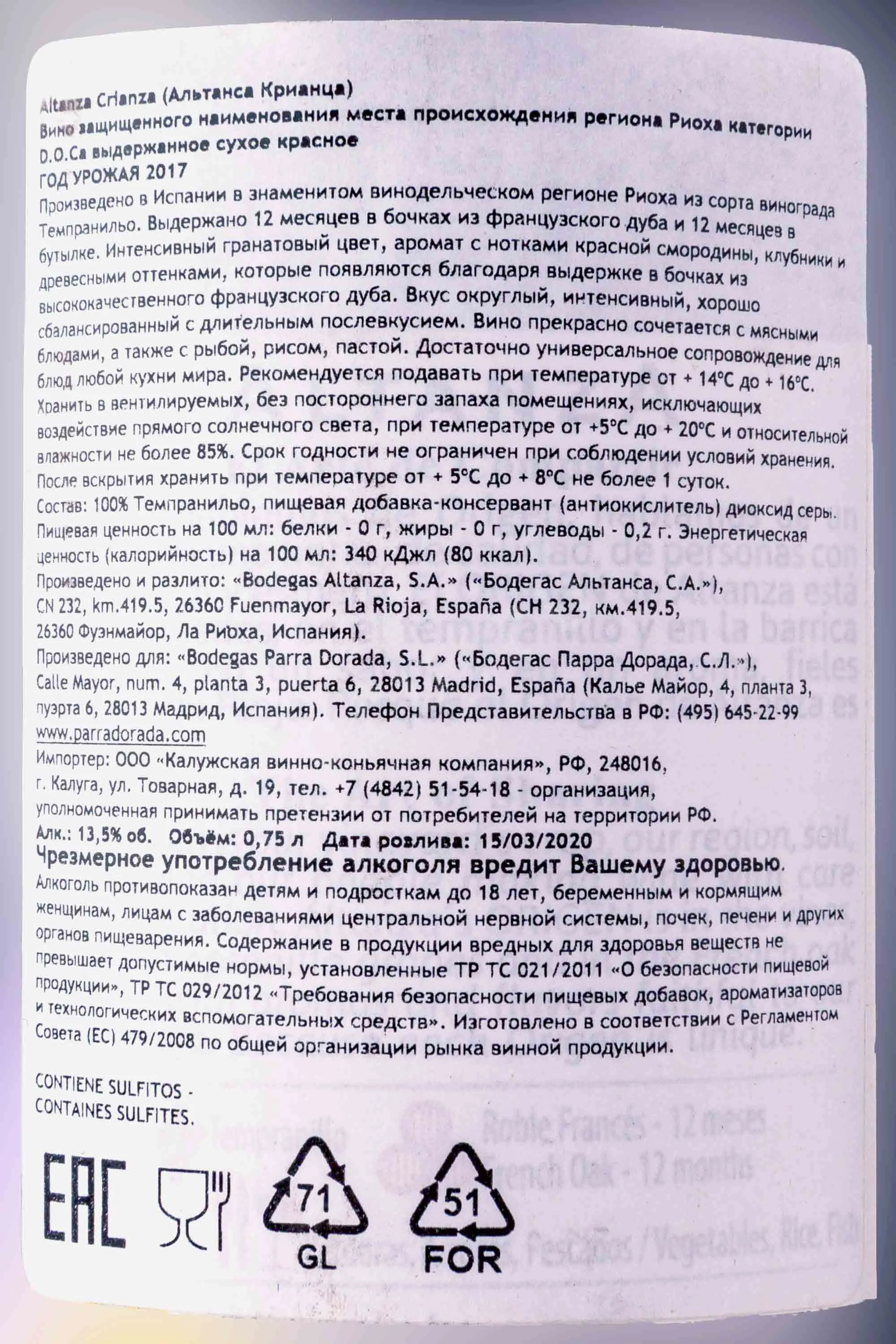 Красное сухое вино Altanza Lealtanza Crianza 2017 года 0,75 л создано в регионе Риоха, где виноградники расположены на высоте в зоне умеренного климата на участках с глинисто-известняковыми почвами. 2017 года был непростым: весна принесла заморозки, что снизило объем урожая, но оставшиеся ягоды отличались концентрацией вкуса и ароматов. Вино изготовлено по классической технологии с ферментацией в нержавеющих емкостях при контролируемой температуре. Выдержка проходила в бочках из французского дуба около 12 месяцев, затем еще столько же напиток «отдыхал» в бутылке для достижения гармонии. Это вино неоднократно получало высокие оценки критиков, включая попадание в престижные рейтинги, что подтверждает его стабильное качество и яркий стиль.