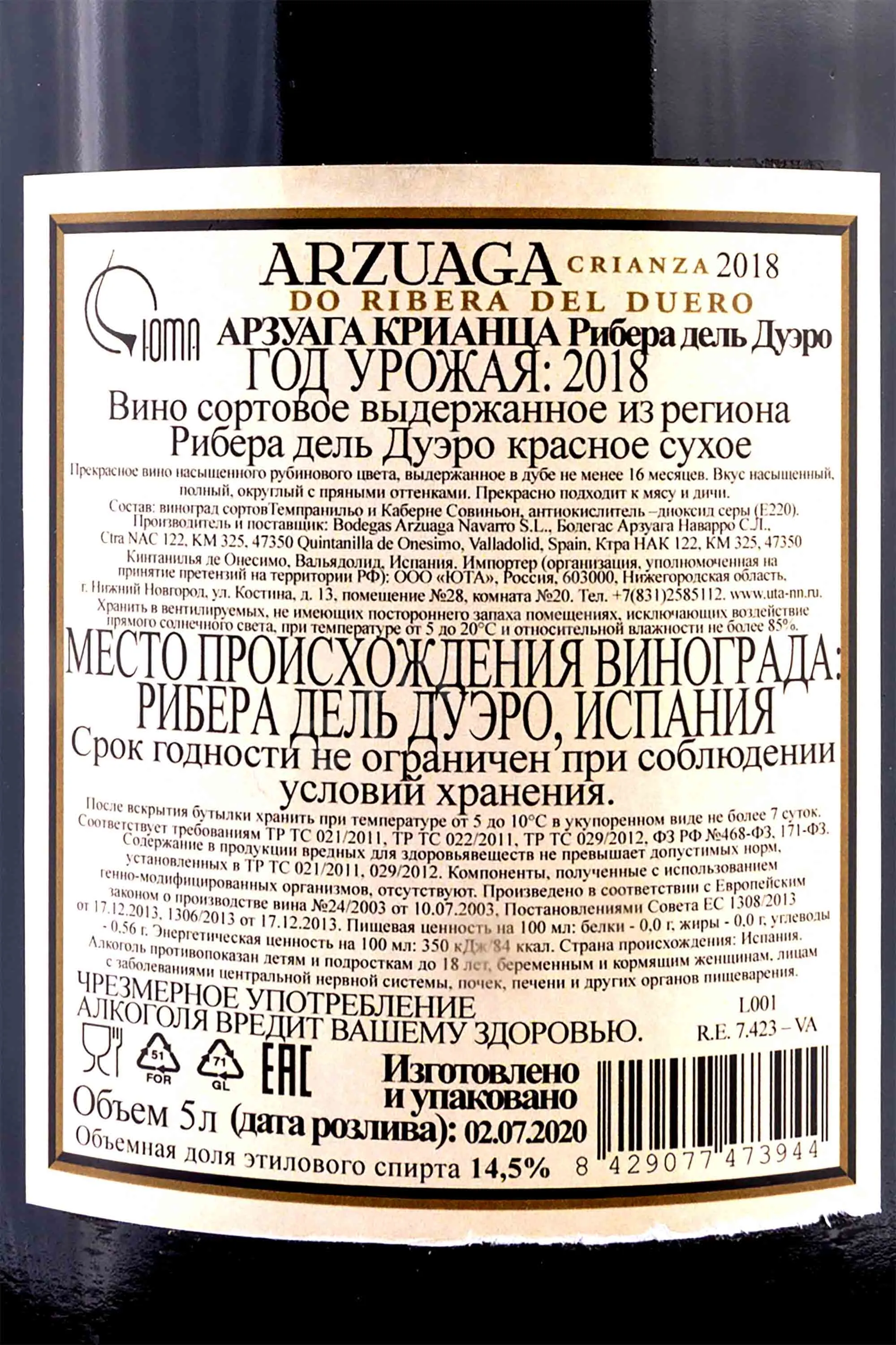 Арзуага Крианца Рибера дель Дуэро в деревянной коробке 2018 5