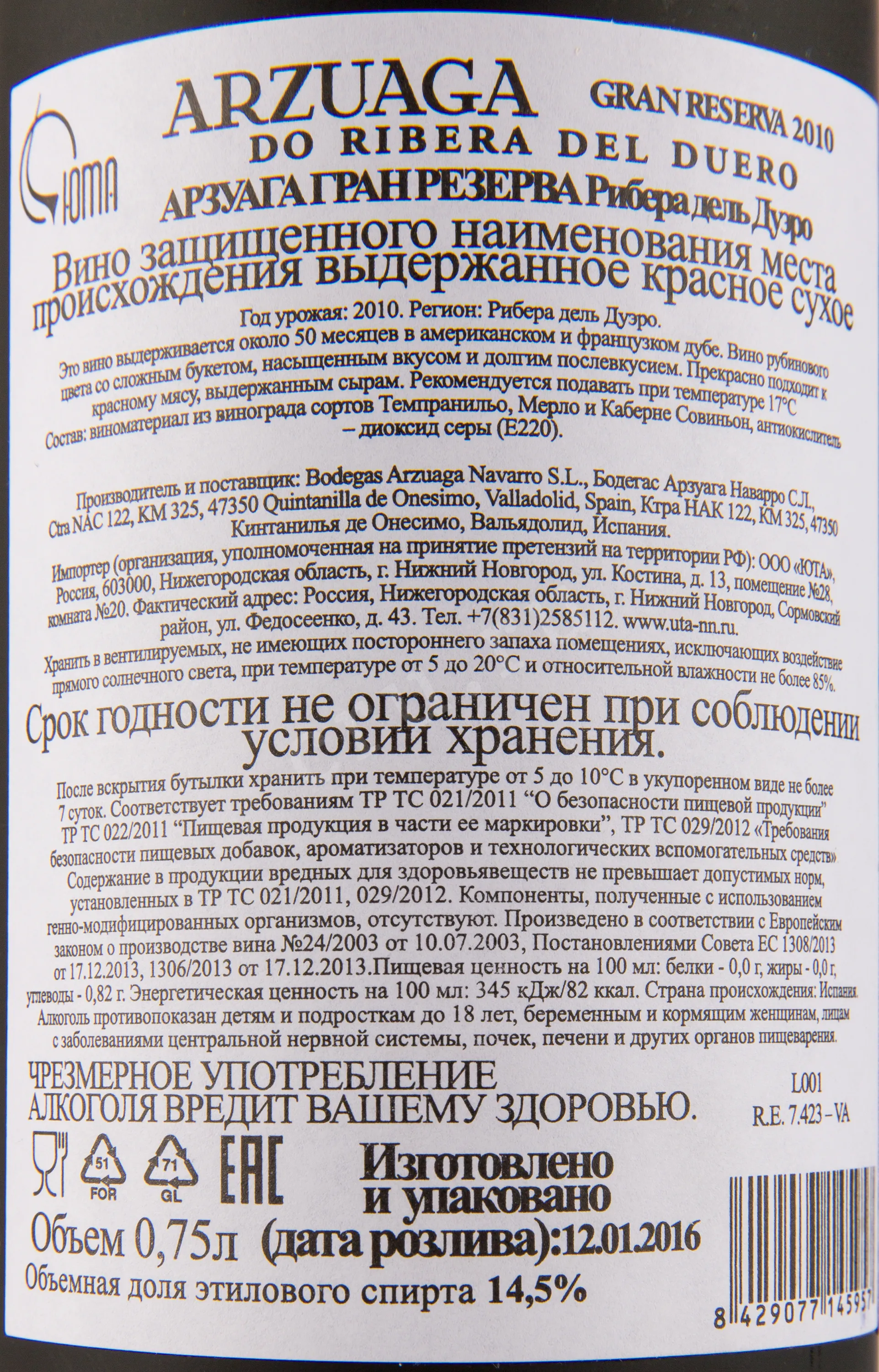 Красное сухое вино Arzuaga Gran Reserva Ribera Del Duero 2010 года 0,75 л создано в классическом стиле региона Рибера-дель-Дуэро. Виноградники расположены на высоких плато с известняково-глинистыми почвами в зоне континентального климата, для которого характерны жаркое лето и холодная зима. Урожай 2010 года считается удачным: баланс осадков и солнечных дней позволил ягодам равномерно вызреть и сохранить кислотность. Вино прошло традиционную ферментацию при контролируемой температуре и долгую выдержку (50 месяцев) в бочках из французского и американского дуба. После розлива оно несколько лет отдыхало в бутылках, приобретая сложность и гармонию. Винтаж 2020 года отмечен критиками за глубину и потенциал к хранению, он входит в число эталонных вин хозяйства Арзуага.