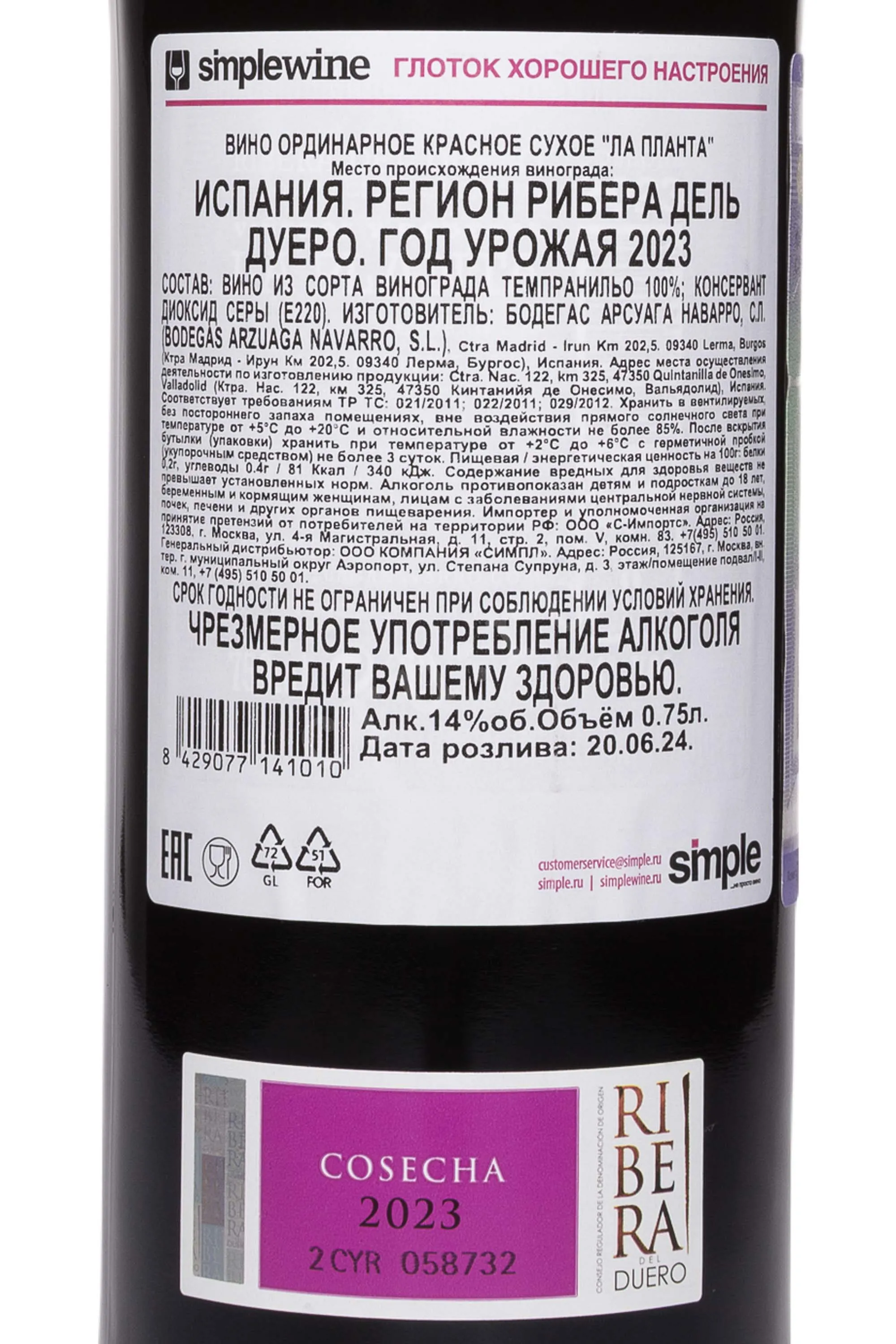 Вино Arzuaga Navarro La Planta 2023 0,75 л создаётся на семейной винодельне Арзуага, расположенной в живописном испанском крае Рибера дель Дуэро, что входит в регион Кастилья и Леон. В основе напитка – виноград темпранильо, характерный для местности, богатой известняками и глинистыми почвами. Грозди собирают исключительно вручную, ферментируют около недели в резервуарах, строго удерживая температуру около 22 градусов. Затем в течение полугода вино дозревает в дубе – его помещают в бочки двух типов (из Франции и США), которые придают напитку деликатные оттенки специй и древесины.