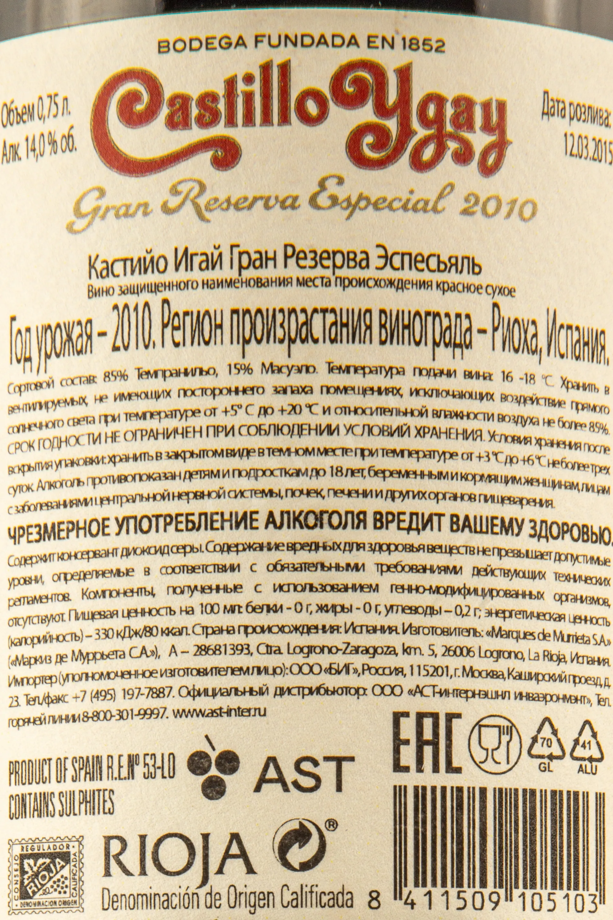 Красное сухое вино Marques de Murrieta Castillo Ygay Gran Reserva Especial 2010 года 0,75 л — настоящая легенда Риохи, олицетворение элегантности, сложности и гармонии вкуса. Винтаж 2010 года получил 94 балла от Wine Spectator (Незаурядное вино»), 97 от Robert Parker («Выдающееся») и 96 от Wine&Spirits («Шедевральное»). Виноградник Ла Плана, с которого поступает сырье для производства, расположен на высоте 485 м. Он находится на исторических землях хозяйства Маркиз де Муррьета. В 2010 году считается была мягкая весна, лето выдалось теплым, с оптимальным количеством осадков, что позволило ягодам созреть равномерно. Урожай собирали в 2 этапа с конца сентября по конец октября вручную и малыми партиями. Виноград перебрали и отделили от гребней, после чего мягко прессовали. Сусло 11 дней мацерировали в стальных емкостях с ежедневным ремонтажем, что обеспечило насыщенный цвет и богатство аромата при мягких танинах. Выдержка в новых дубовых бочках заняла более 3 лет, а затем вино дозревало в бутылках не еще столько же. Благодаря этому оно приобрело благородную структуру, многослойность и тончайший баланс, что принесло ему признание критиков и места в авторитетных рейтингах.