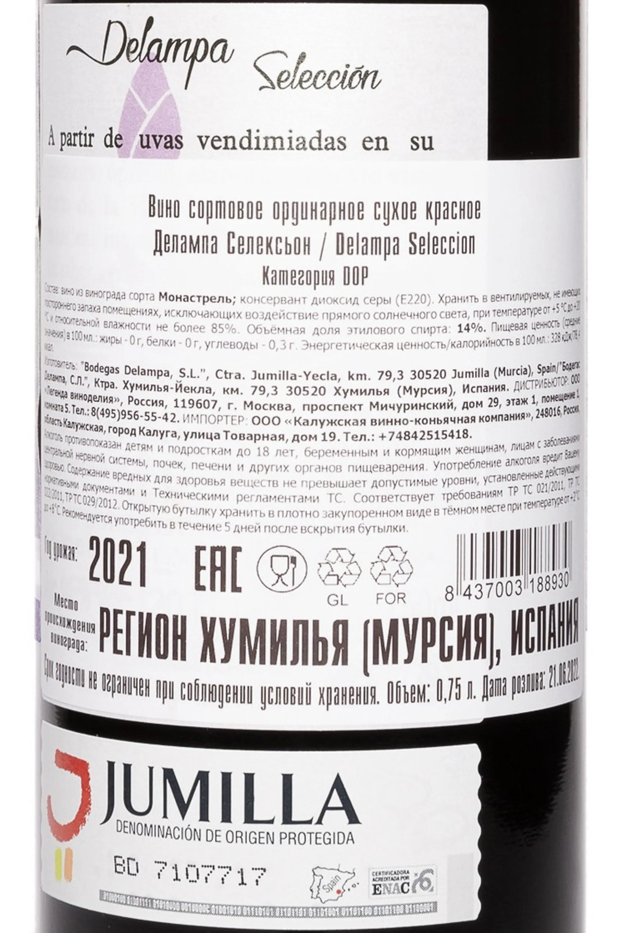 Красное сухое вино Delampa Seleccion 2021 года 0,75 л создано в современной средиземноморской стилистике, где главная цель — выразить натуральный характер спелого винограда и гармонию терруара. Сорт Монастрель, использовавшийся в качестве сырья, был выращен на солнечных склонах с известняковыми и глинистыми почвами, что обеспечило баланс между свежестью вкуса и структурой. 2021 год отличался тёплой весной и умеренно жарким летом, что позволило ягодам равномерно созреть, сохранив аромат и кислотность. Ферментация проходила в стальных емкостях при контролируемой температуре, что дало возможность сохранить чистоту фруктового профиля. Выдержка в дубовых бочках придала напитку мягкость и лёгкие пряные ноты.