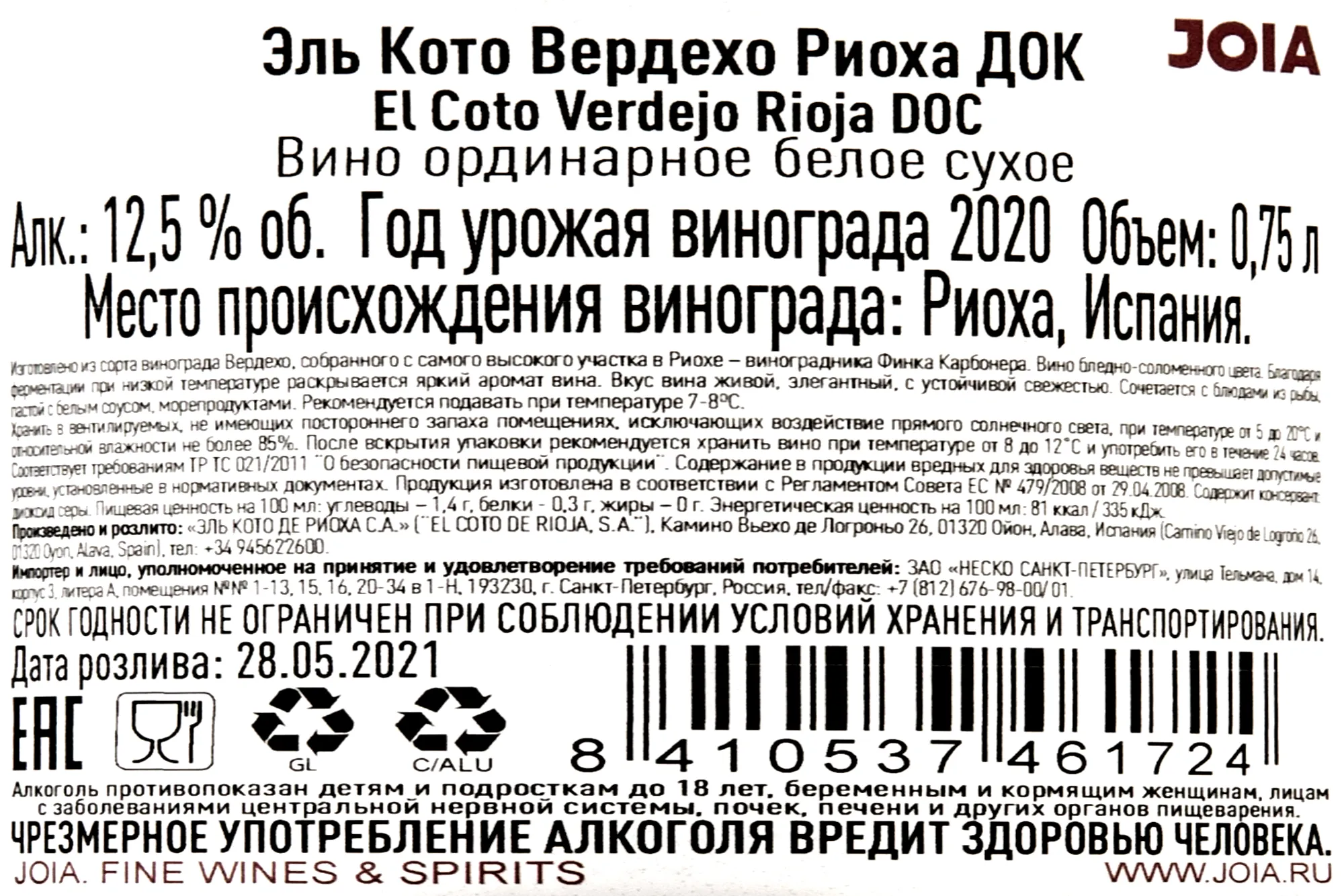 Белое сухое вино El Coto Verdejo Rioja DOC 2020 года 0,75 л создано в современном стиле с акцентом на свежесть и чистоту вкуса. Виноград сорта Вердехо выращен в зоне с умеренным климатом и перепадом дневных и ночных температур, что помогает сохранить кислотность и яркость аромата. 2020 год был благоприятным: умеренные осадки и теплая погода обеспечили равномерное созревание ягод. Ферментация проходила в стальных емкостях при низкой температуре для сохранения фруктового профиля, выдержка была недолгой, что дало возможность подчеркнуть молодость и живость вина. Уникальность этого релиза заключается в том, что дом Эль Кото традиционно известен своими красными образцами, а выпуск белого Вердехо стал важным шагом к расширению линейки. Вино получило положительные отзывы критиков за баланс и свежесть.