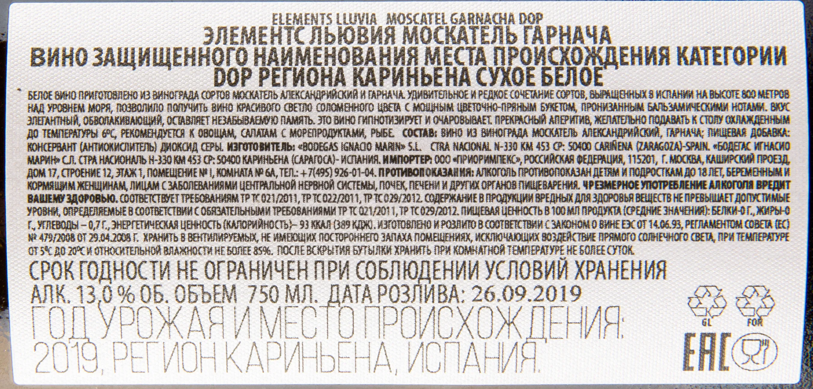 Elements Lluvia Moscatel & Garnacha 2019 0.75 л купить - Испанское вино Элементс Льювия Москатель Гарнача цена в магазинег. Москва, ул. Профсоюзная, д. 16/1010:00-22:00 Ежедневно+7 (495) 920-20-02info@cru.ru