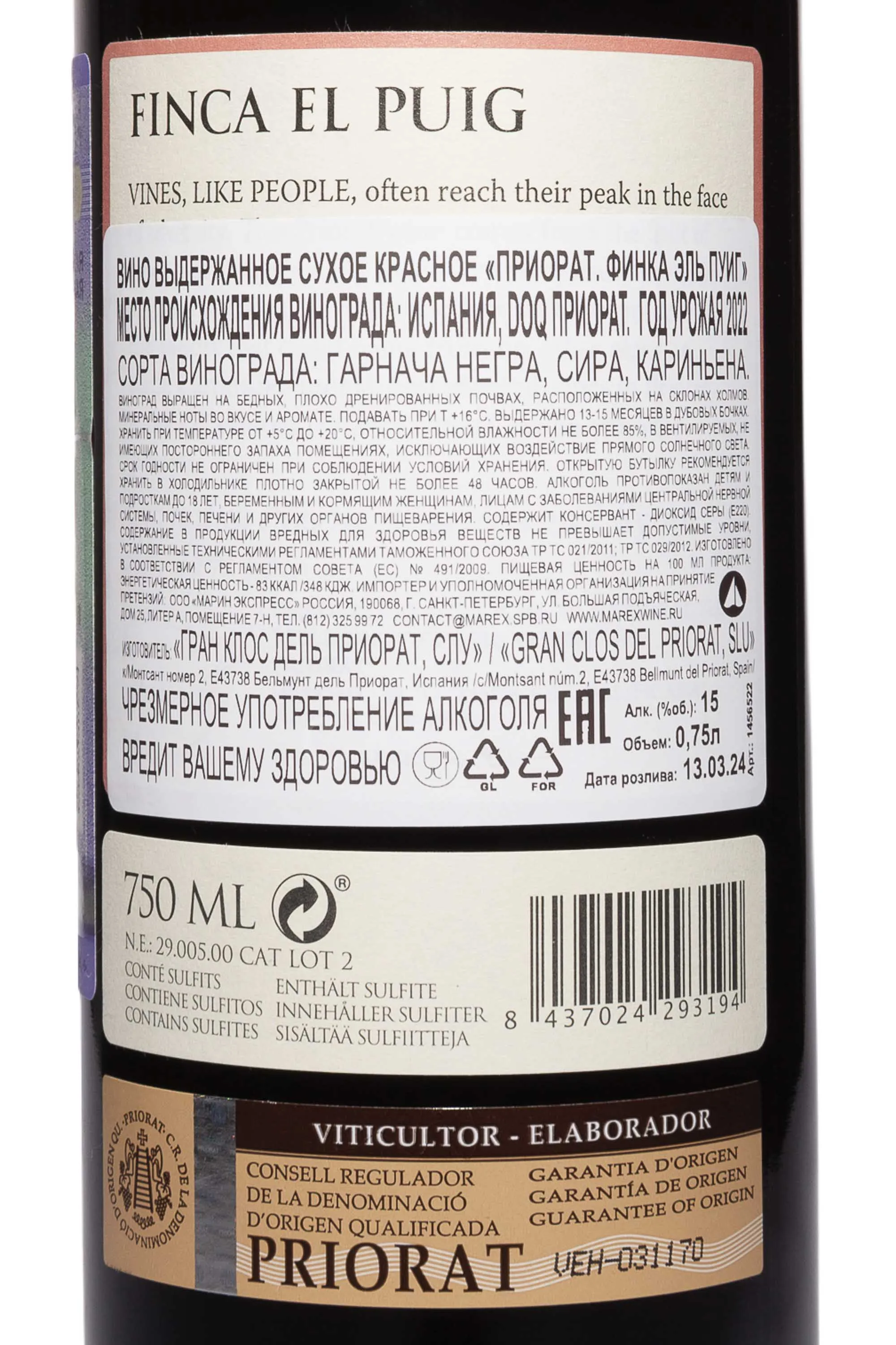 Вино Gran Clos Finca El Puig Priorat DOQ 2022 года 0,75 л открывает стилистику плотного, насыщенного и при этом аккуратно структурированного красного вина. Урожай собран на крутых склонах Приората, где сланцевые почвы и сухой жаркий сезон 2022 года придали ягодам высокую концентрацию и минеральный характер. Лозы участка Finca El Puig достигают возраста до 60 лет. Они дают небольшое количество плодов, но ягоды формируют глубокий вкус. Винификация включает короткую холодную мацерацию, затем контролируемое брожение и длительный контакт с кожицей. Выдержка проходит в бочках из французского дуба, часть которых новые. Она длится около 14 месяцев и формирует сложный ароматический профиль. Вино выделяется плотной текстурой и гармонией, высоко оценивается критиками и часто упоминается как одно из выразительных красных вин района.