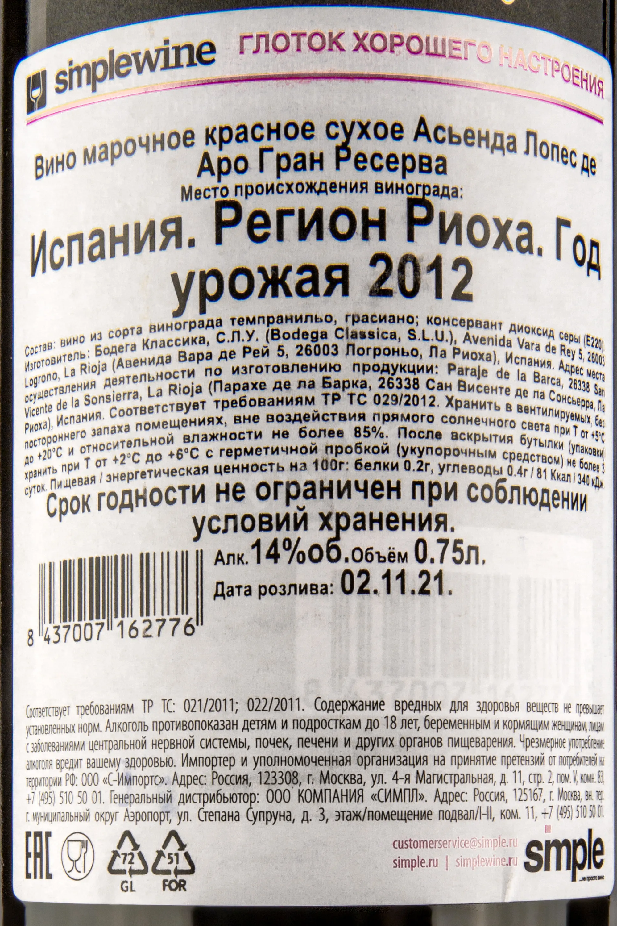 Hacienda Lopez de Haro Gran Reserva 0.75 л купить - Испанское вино Асьенда Лопес де Гран Ресерва цена в магазине г. Москва, ул. Профсоюзная, д. 16/10 10:00-22:00 Ежедневно +7 (495) 920-20-02 info@cru.ru
