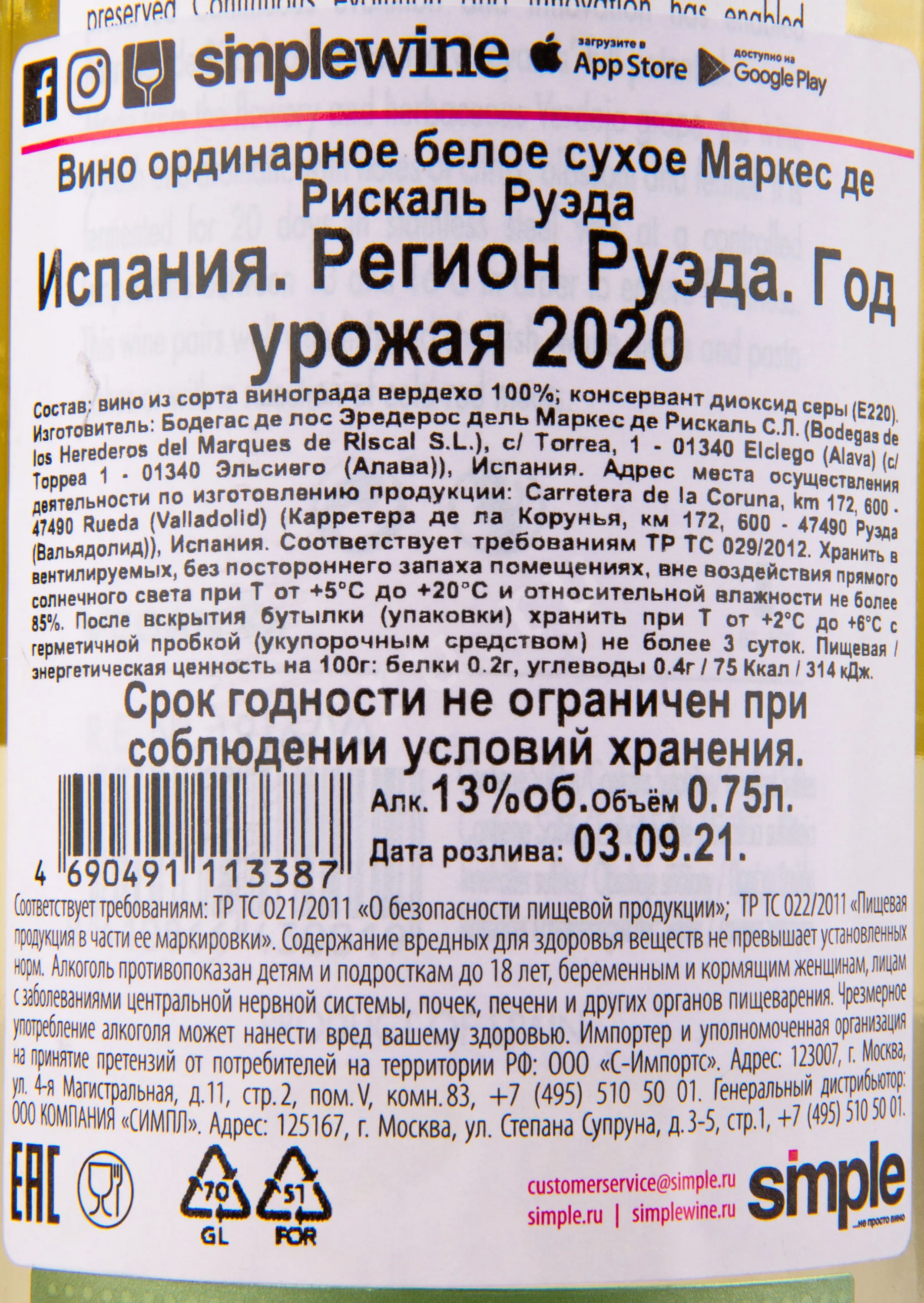 Белое сухое вино Herederos del Marques de Riscal Rueda 2020 года 0,75 л создано в свежей, элегантной стилистике белых сортов региона Руэда. Виноград Вердехо выращен на песчано-гравийных почвах с примесью известняка, в условиях континентального климата с резкими перепадами температур между днём и ночью. Такой терруар сохраняет яркую кислотность и насыщенный аромат. Ферментация проходит при низкой контролируемой температуре в стальных емкостях, что позволяет сберечь природную фруктовость. Выдержка непродолжительная, без дуба, что подчёркивает свежесть и чистоту вкуса. Производитель — один из пионеров белого винодельческого стиля Руэды, начиная с 1970-х годов, внёсший большой вклад в формирование современного облика региона.