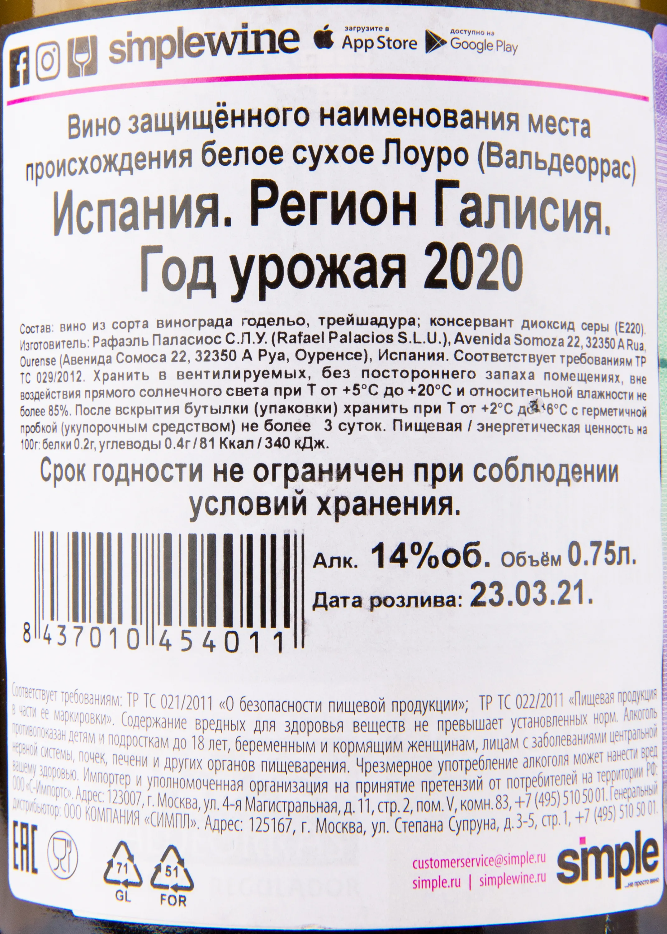 Белое сухое вино Louro do Bolo Valdeorras 2020 года 0,75 л создано в Галисии, в регионе Вальдеоррас, известном своими каменистыми почвами и прохладным атлантическим климатом. Сезон 2020 выдался сбалансированным: весна была мягкой, лето — теплым и сухим, без экстремальных перепадов, что обеспечило винограду хорошую концентрацию и свежесть. Вино произведено из 2 автохтонных сортов, выращенных на террасах с гранитными и сланцевыми почвами, богатыми минералами. Ферментация проходила в дубовых бочках с естественными дрожжами, после чего вино выдерживалось на тонком осадке, что придало ему структуру и глубину вкуса. Оно неоднократно получало высокие оценки международных критиков, отмечающих его баланс и потенциал к выдержке.