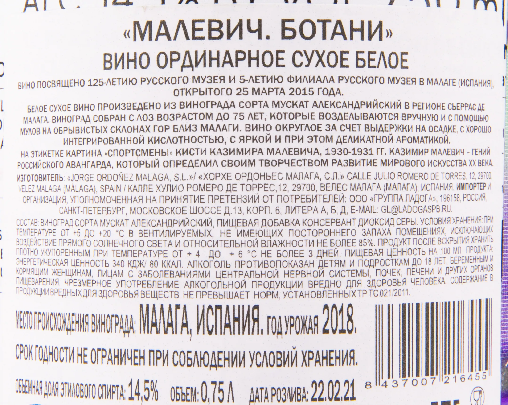 Белое сухое вино Malevich Botani 2018 года 0,75 л — часть «Винной коллекции Русского музея». Оно было создано в год его 125-летнего юбилея и 5-летия зарубежного филиала в испанской Малаге. Этикетка украшена картиной Казимира Малевича «Спортсмены», что подчеркивает связь искусства и виноделия. Производителем является Grupo Jorge Ordonez. В качестве сырья был использован сорт Мускат Александрийский. Виноградники с 70-летними лозами находятся в регионе Малага (Андалусия). Уникальность терруара обусловлена сочетанием природных факторов, таких как твердые сланцевые почвы, резкий рельеф склонов, близость к средиземноморскому побережью, сухой и жаркий климат. Урожай 2018 года оказался удачным: лето было солнечным, а морской бриз обеспечил равномерное созревание ягод. Ферментация проходила в стальных резервуарах с использованием природных дрожжей, после чего вино восемь месяцев выдерживалось в тех же емкостях, сохраняя свежесть и естественную минеральность.