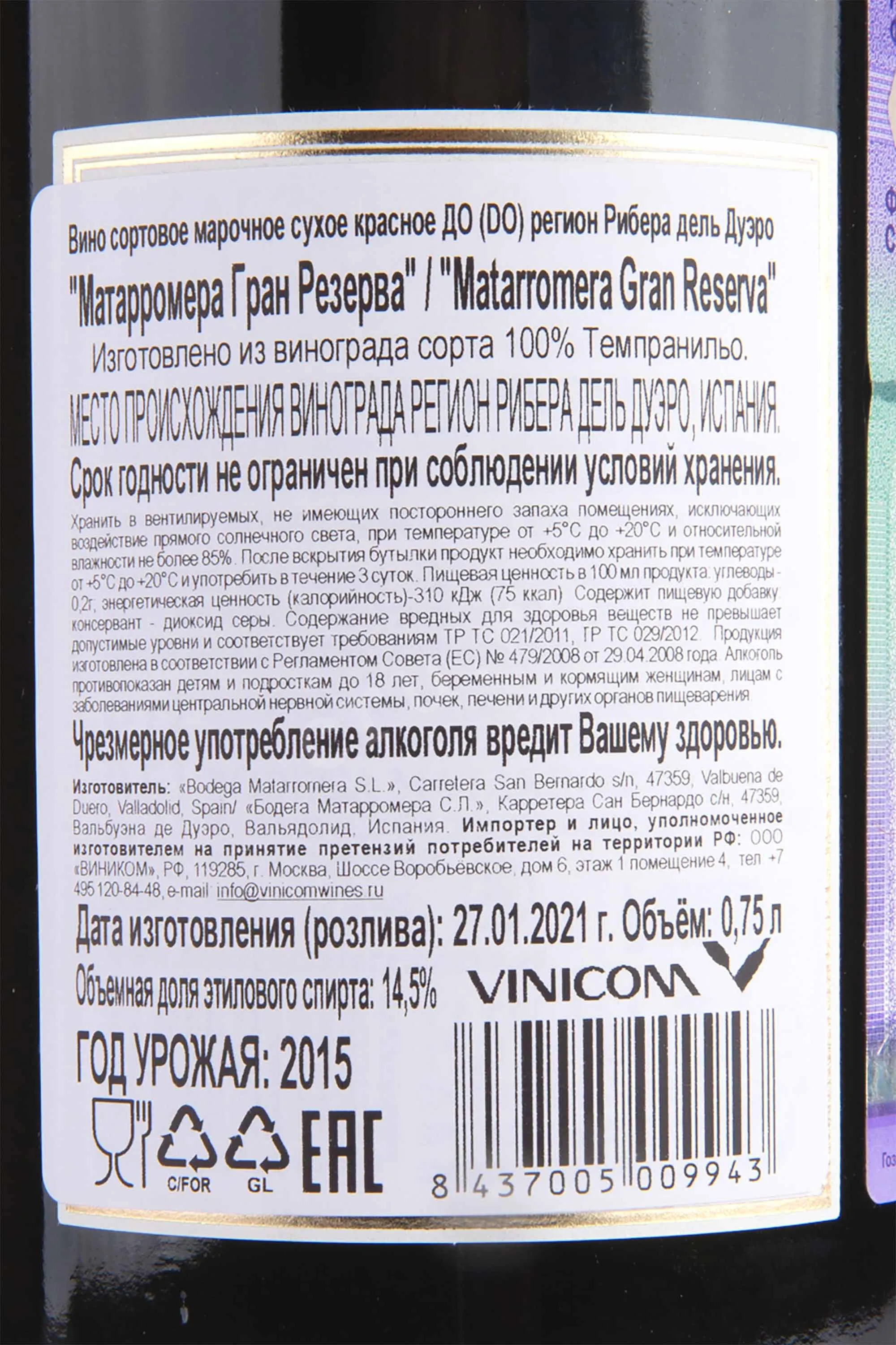 Красное сухое вино Matarromera Gran Reserva Ribera del Duero 2015 года 0,75 л создано в классическом стиле с акцентом на мощь и благородство. Урожай 2015 года в Рибера-дель-Дуэро был удачным: теплое лето и умеренные осадки обеспечили идеальное созревание ягод. Виноград собран на виноградниках «Сан-Роман» и «Финка-де-лас-Селадильяс» в долине Дуэро, где известняковые склоны формируют минерализованный характер вина. Проводились ручной сбор, тройная сортировка винограда и винификация с местными дрожжами. Ферментация осуществлялась при 28 °C в течение двух недель. Затем вино выдерживали 3 года в бочках из французского и американского дуба. Дополнительные 24 месяца бутылочной выдержки сделали его вкус округлым и гармоничным. Винтаж 2015 года отмечен критиками: 92/100 Wine Spectator, 95/100 Wine Enthusiast, 93/100 James Suckling.