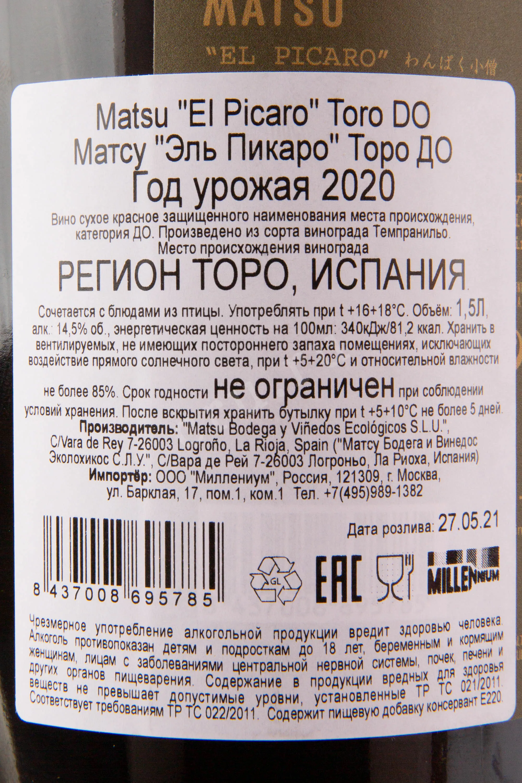 Красное сухое вино Matsu El Picaro Toro 2022 года 1,5 л — самое молодое в коллекции бренда Матсу, символизирующее собой юность и энергию. Виноградники находятся в регионе Торо на высоте 650–700 м, на песчано-глинистых почвах с галькой. 2022 год в Испании был жарким и засушливым, что снизило урожайность, но придало ягодам высокую концентрацию вкуса. Сбор проводили вручную с 24 сентября по 11 октября, используя ящики и малые прицепы, чтобы сохранить целостность плодов. Ферментация и мацерация протекали в небольших бетонных резервуарах с натуральными дрожжами при температуре не выше 24 °C. Вино два месяца выдерживалось на тонком осадке без осветления, подвергаясь лишь мягкой фильтрации. Виниаж 2022 года получил 90 баллов от критика Джеймса Саклинга («Неординарный»). Яркая портретная этикетка с образом молодого винодела подчеркивает бунтарский характер напитка.