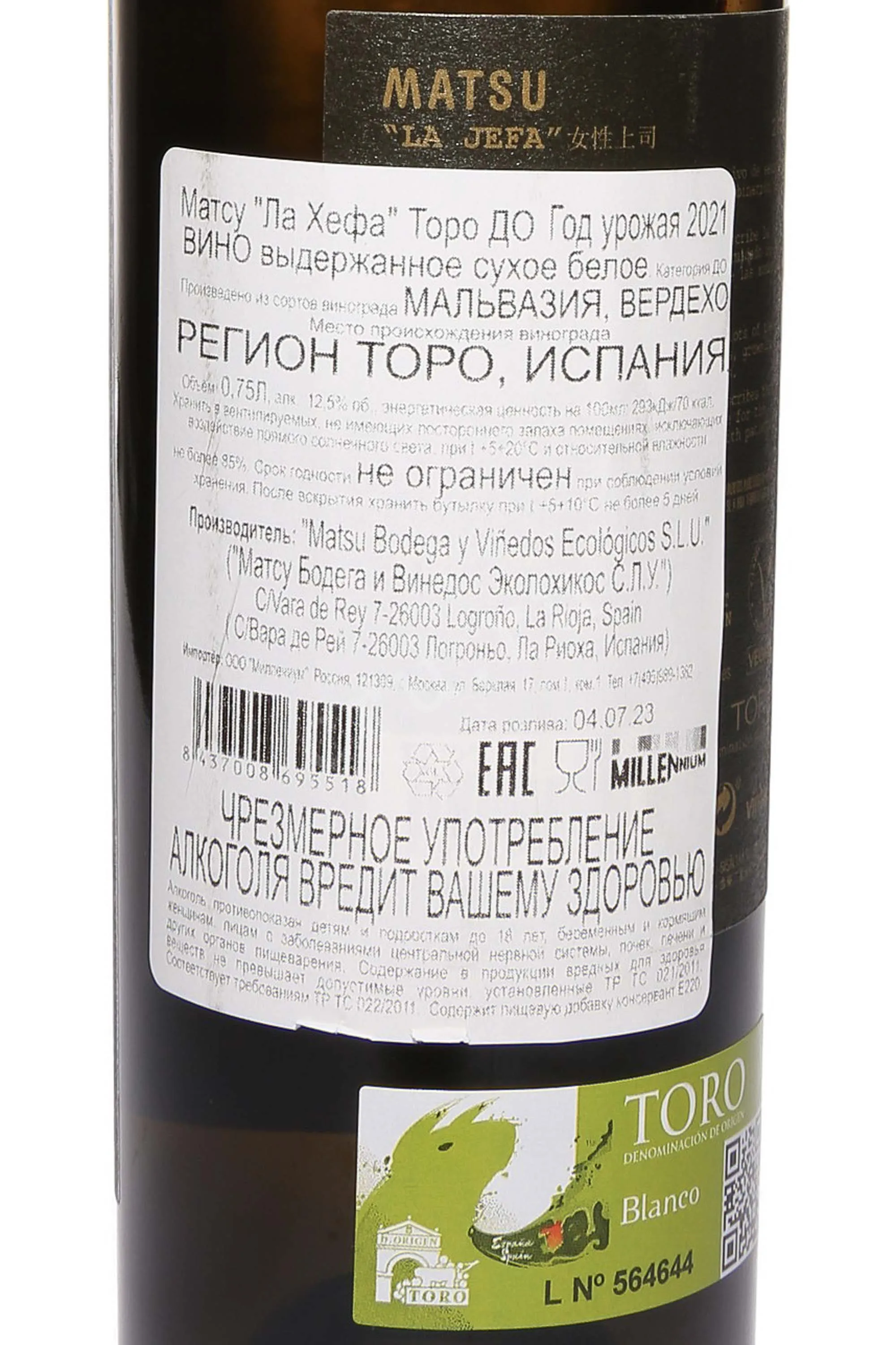 Белое сухое вино Matsu La Jefa Toro DO 2021 года 0,75 л создано в регионе Торо, который известен жарким континентальным климатом и песчаными почвами с примесью глины и гранитных камней. Виноград здесь вызревает медленно, на старых лозах (50-150 лет), что придает ягодам высокую концентрацию вкуса и сложность. 2021 год отличался теплым летом и умеренными осадками, что позволило собрать здоровый и хорошо сбалансированный виноград. Ферментация протекала спонтанно с натуральными дрожжами в дубовых французских бочках (легкий обжиг) по 600 л с последующей выдержкой на осадке 14 месяцев, что добавило вину глубину и кремовую текстуру. Уникальность заключается в том, что это одно из немногих белых вин, выпускаемых в зоне Торо, традиционно знаменитой красными сортами. Оно получило высокие оценки критиков за новаторский стиль и гармоничное сочетание свежести и сложности.