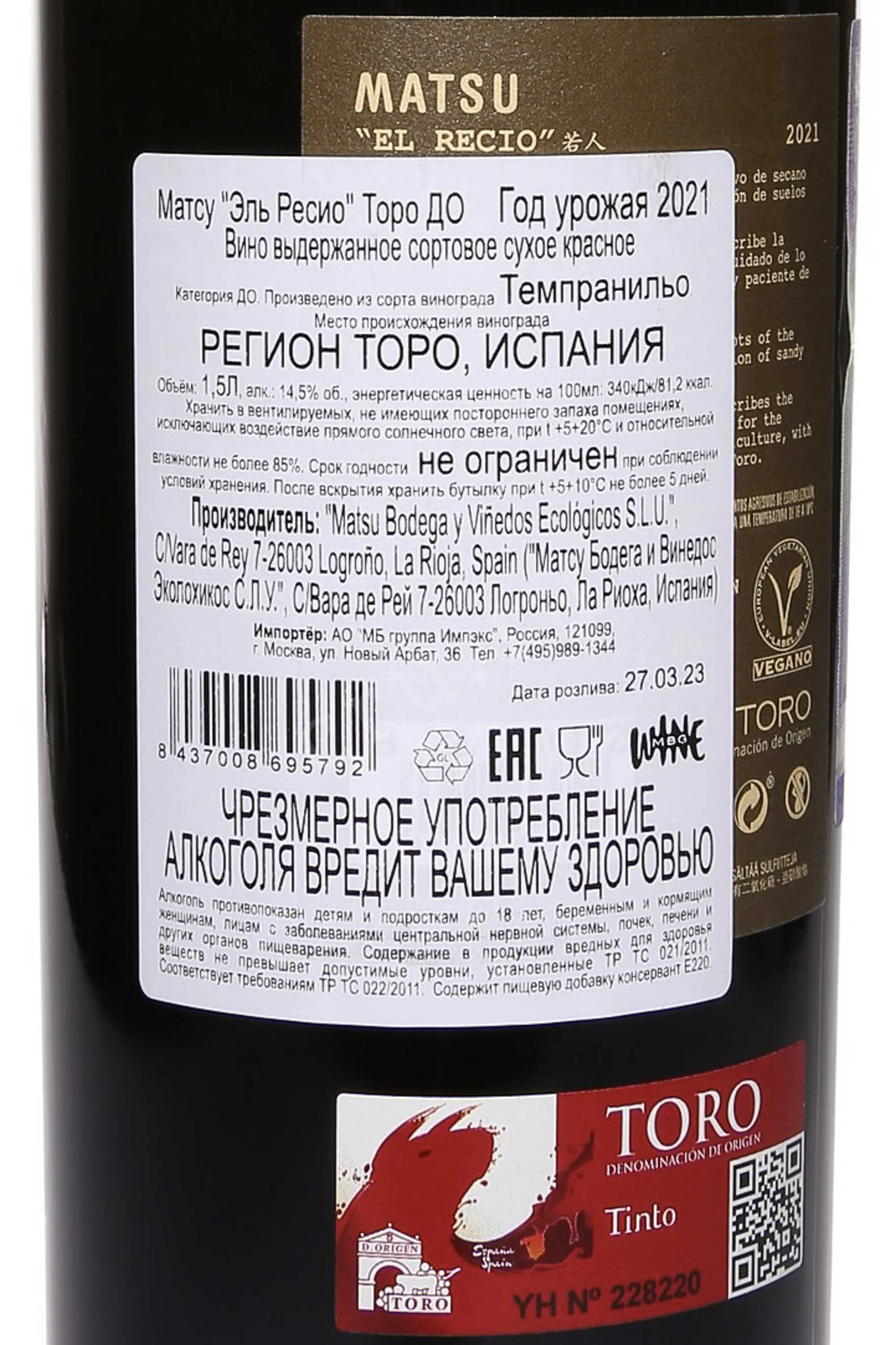 Красное сухое вино Matsu Recio 2021 года 0,75 л создано в регионе Торо, где виноградники расположены на каменистых почвах с песчаным и глинистым основанием. Климат здесь континентальный, с жарким летом и холодной зимой, что позволяет ягодам созревать равномерно и сохранять насыщенный вкус. Урожай 2021 года был удачным: летний период оказался прохладнее, чем обычно, август выдался дождливым, сентябрь был теплым и пасмурным — такие условия замедлили созревание и обеспечили гармоничную кислотность сырья. Виноделы использовали традиционный метод ферментации при контролируемой температуре (3 недели), а затем проводилась малолактика в дубовых французских и восточно-европейских бочках, которая придала вину мягкость и глубину. Выдержка в дубе протекала 14 месяцев. Вино не фильтровали и не осветляли перед бутилированием. Matsu Recio ценится за гармоничное сочетание силы и элегантности, его отмечают критики за выразительный характер и сбалансированный стиль. Винтаж 2021 года получил 92/100 от Guia Penin («Отличное вино»).