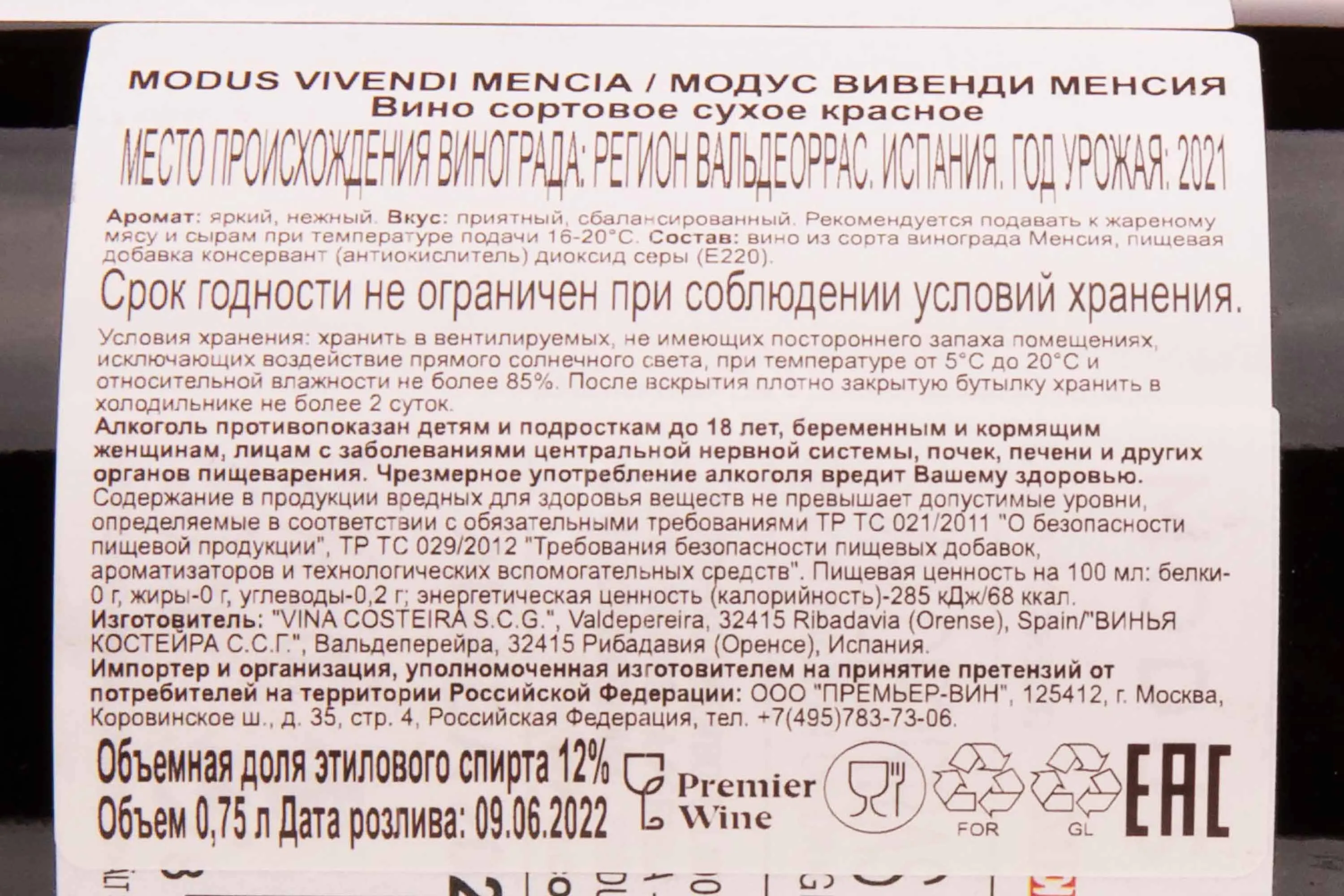 Modus Vivendi Mencia 0.75 л купить - Испанское вино Модус Вивенди Менсия цена в магазине г. Москва, ул. Профсоюзная, д. 16/10 10:00-22:00 Ежедневно +7 (495) 920-20-02 info@cru.ru