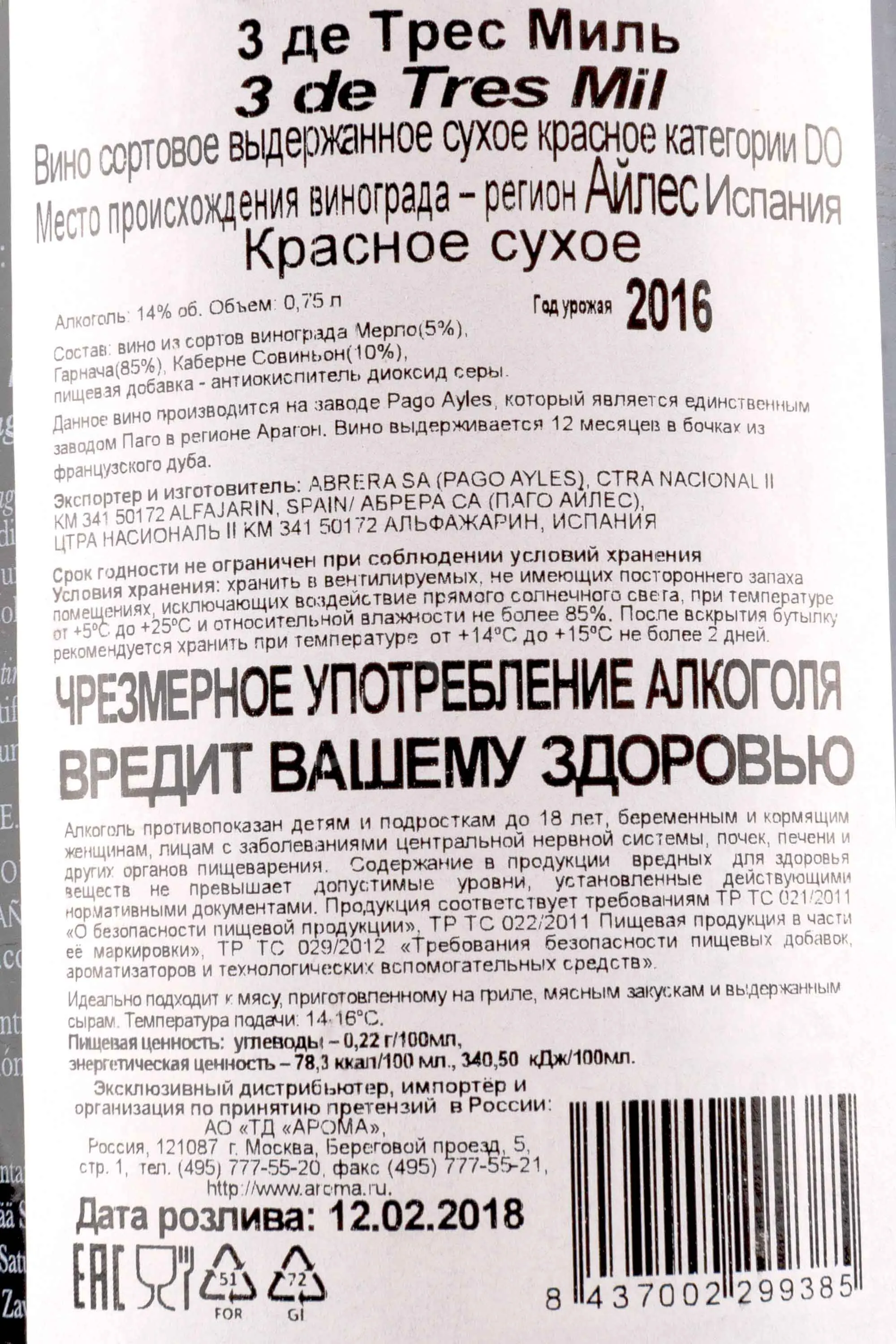 Красное сухое вино Ayles «3» de Tres Mil 2016 года 0,75 л создано в одном из немногих хозяйств Испании с категорией Vino de Pago. Виноградники расположены в Арагоне, где континентальный климат с резкими перепадами температур и бедные каменистые почвы придают ягодам насыщенность и структуру. Урожай 2016 года оказался удачным: зима была холодной, весна дождливой, а лето теплым, что обеспечило равномерное созревание и яркий ароматический профиль. Вино прошло традиционную ферментацию в стальных емкостях, после чего выдерживалось в дубовых французских бочках около года. Такая технология дала глубину вкуса и гармонию. Уникальность вина в том, что оно входит в линейку ограниченного выпуска, получало высокие оценки винных критиков и не раз упоминалось в престижных рейтингах.