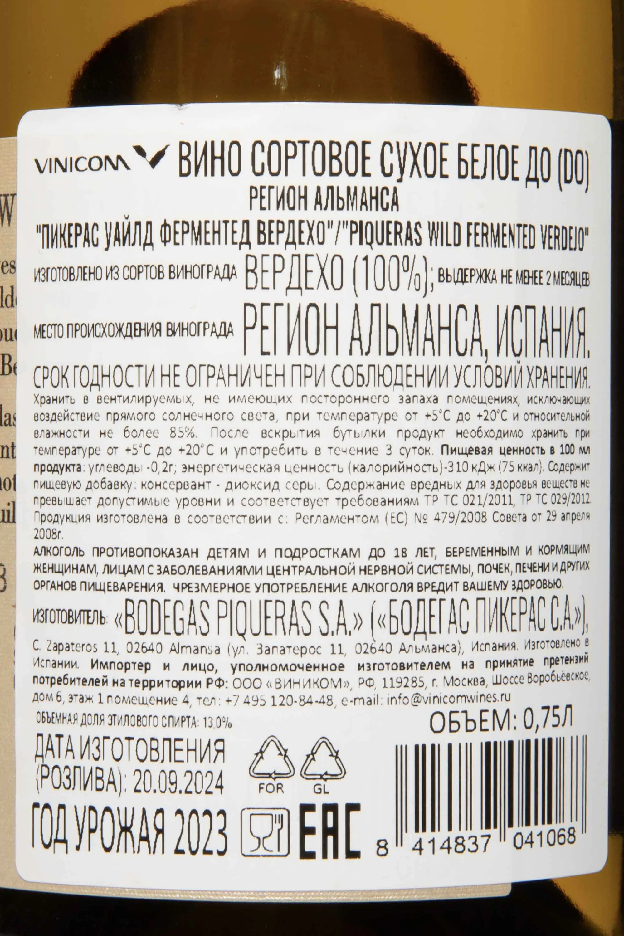 Белое сухое вино Piqueras Wild Fermented Verdejo 2023 года 0,75 л рождено в регионе Альманса, где виноградники растут на высоте свыше 900 метров. Почвы здесь каменистые и известняковые, климат сухой и солнечный, что помогает ягодам сохранять яркую кислотность и насыщенный аромат. 2023 год отличился умеренными температурами и стабильной погодой, без резких перепадов, благодаря чему виноград хорошо вызрел. Ферментация проходила с использованием диких дрожжей, что придало обеспечило глубину и текстуру. Часть вина выдерживали на осадке, что придало ему гармоничность и легкую минеральность.