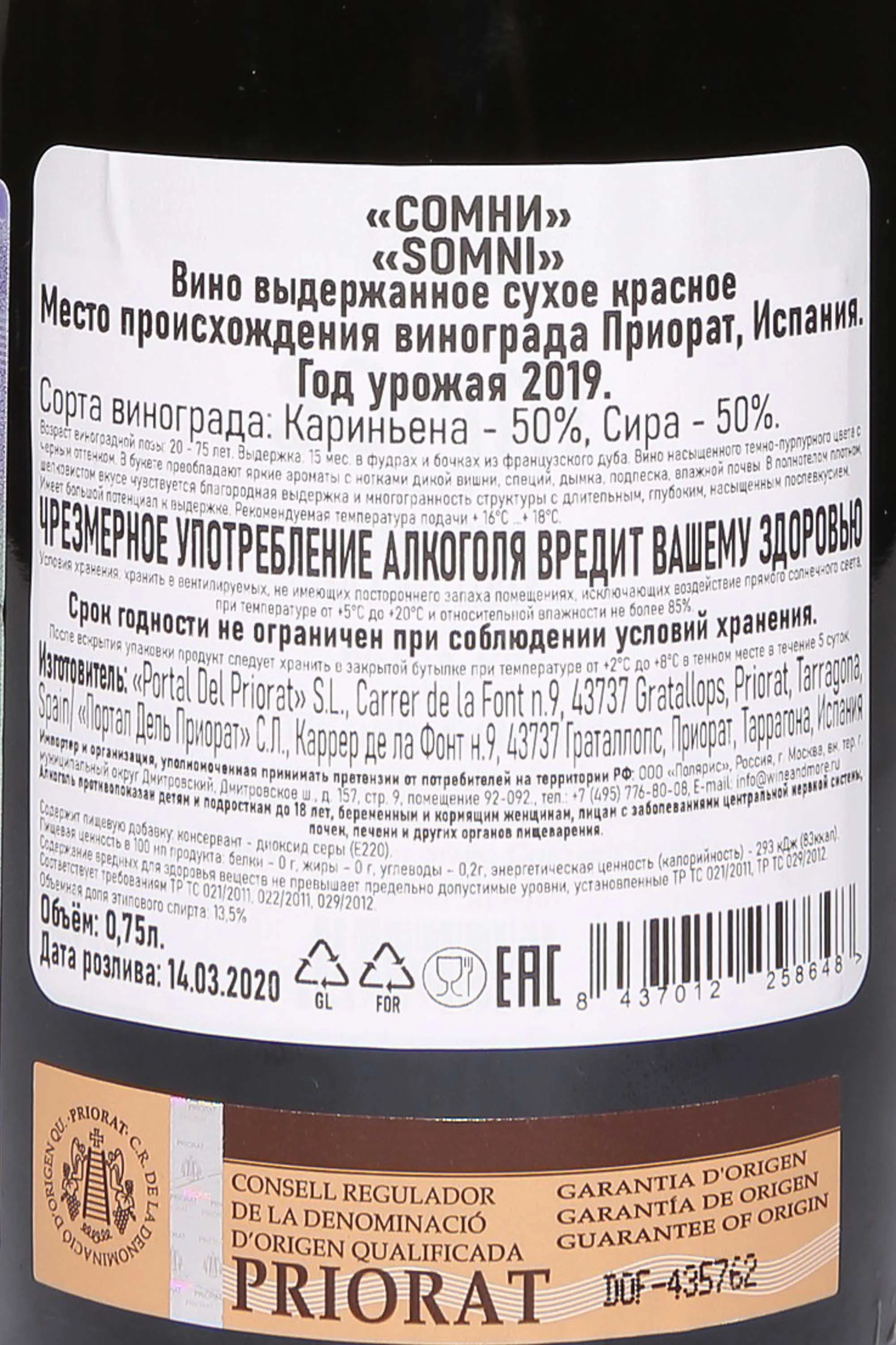 Красное сухое вино Portal del Priorat Clos del Portal Somni 2019 года 0,75 л — флагманский купаж 3 сортов из старых лоз, растущих на террасах и склонах La Plana, Mas del Metge и Mataveres на высоте 320–360 м над уровнем моря. Местные почвы называются «ликорелла» и представляют собой редкую смесь сланца вулканического происхождения, слюды и кварцита. Возраст лоз — от 20 до 75 лет. Они дают небольшие по объему, но концентрированные урожаи. В 2017 погодные условия в течение всего сезона были благоприятными: весна тёплая, лето жаркое и сухое, осень мягкая. Сбор проводили вручную в октябре. Сусло ферментировали 24 дня в небольших стальных чанах. Выдержка длилась 15 месяцев в барриках из французского дуба и фудрах, после чего вино разлили без фильтрации. Купаж Сомни, что значит «мечта», обладает потенциалом выдержки более 10 лет. Винтаж 2017 года получил 92 балла от Guia Penin («Отличное вино»).
