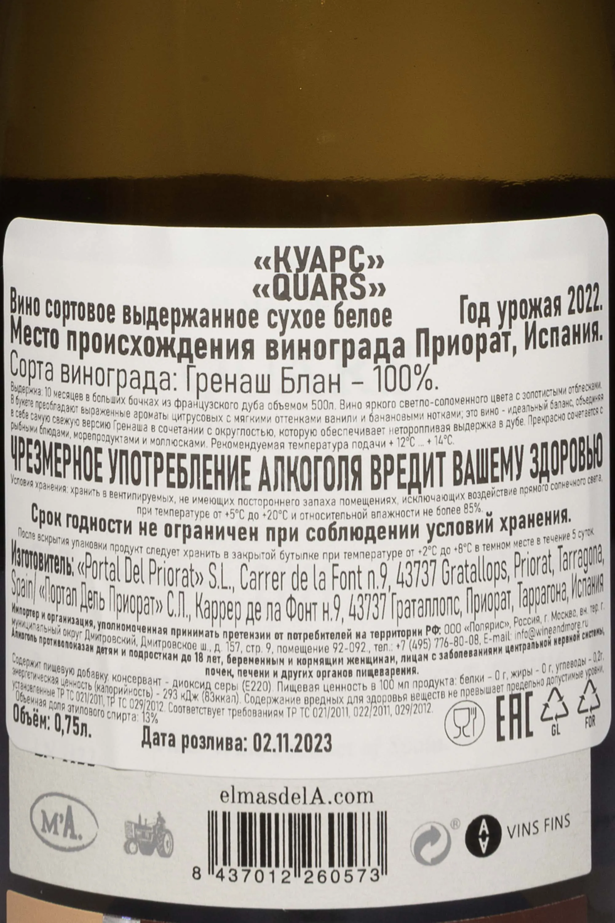 Белое сухое вино Portal del Priorat El Mas de l'A Quars Priorat DOQ 2022 года 0,75 л создано в современной стилистике региона, где белые варианты отличаются плотной структурой и минеральным профилем. Виноград растёт на террасных виноградниках Приората с преобладанием сланцевых почв, что усиливает свежесть и подчёркивает сортовой характер. 2022 год был преимущественно теплым, но довольно засушливым, что снизило урожайность, но обеспечило его отменное качество. Виноград собирали вручную, затем сортировали и частично отделили от гребней. Прессование было мягким, ферментация проходила на природных дрожжах в стальных и бетонных ёмкостях. Выдержка длилась около десяти месяцев в больших дубовых бочках. Такой подход создаёт вино высокой чистоты и баланса. Оно привлекает стабильным качеством и получает положительные отзывы от дегустационных комиссий.