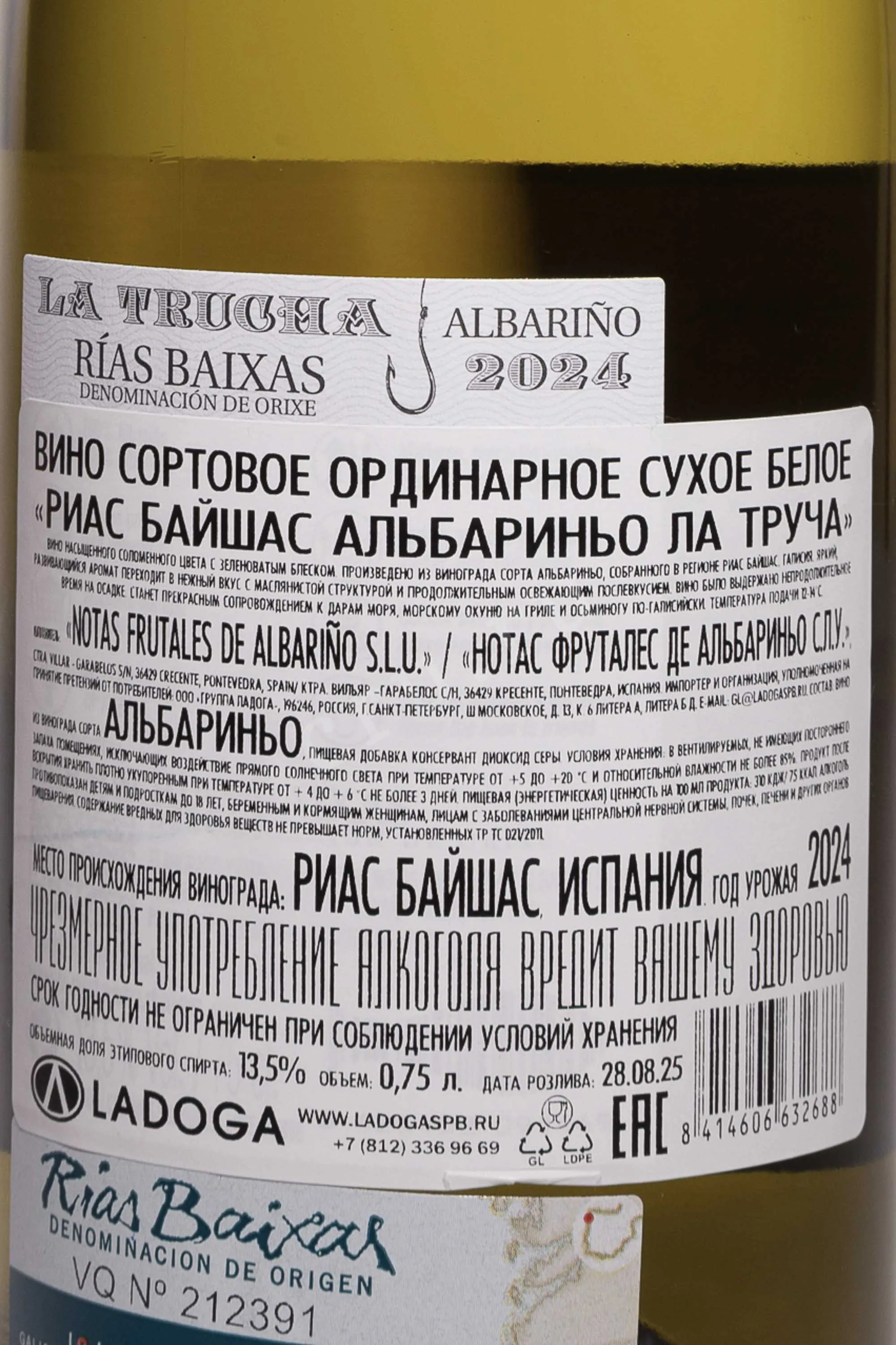 Белое сухое вино La Trucha Albarino Rías Baixas 2024 года 0,75 л создано в Атлантическом регионе Галисии, где прохладный морской климат и гранитные почвы придают ягодам свежесть и минеральность. В 2024 году умеренные температуры и достаточное количество осадков позволили винограду сохранить яркую кислотность и чистоту аромата. Вино произведено из винограда, собранного вручную. Ферментация проходила в стальных емкостях при контролируемой температуре для сохранения фруктовых оттенков. Выдержка на тонком дрожжевом осадке придала напитку объем и мягкую текстуру. La Trucha ценится критиками за стабильное качество и точное выражение стиля Альбариньо, нередко упоминается в специализированных рейтингах и обзорах.