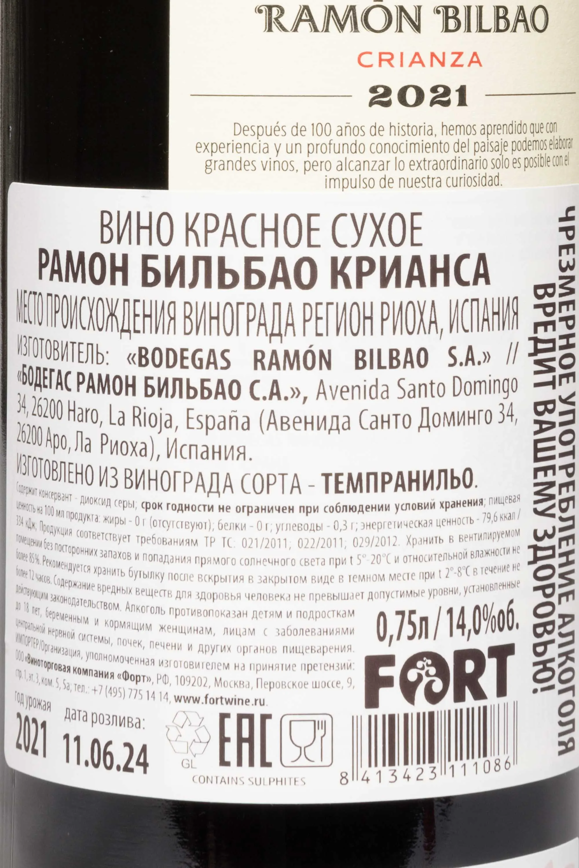 Вино Ramon Bilbao Crianca 2018 г. 0.75 l – это изысканный испанский винтаж, изготовленный из урожая 2018 года. Виноград, выращенный в провинции Риоха, был собран во второй неделе октября. 14-процентное красное сухое вино выдерживалось 14 месяцев в бочках из американского дуба, затем 8 месяцев в бутылках и имеет потенциал хранения до 7 лет.