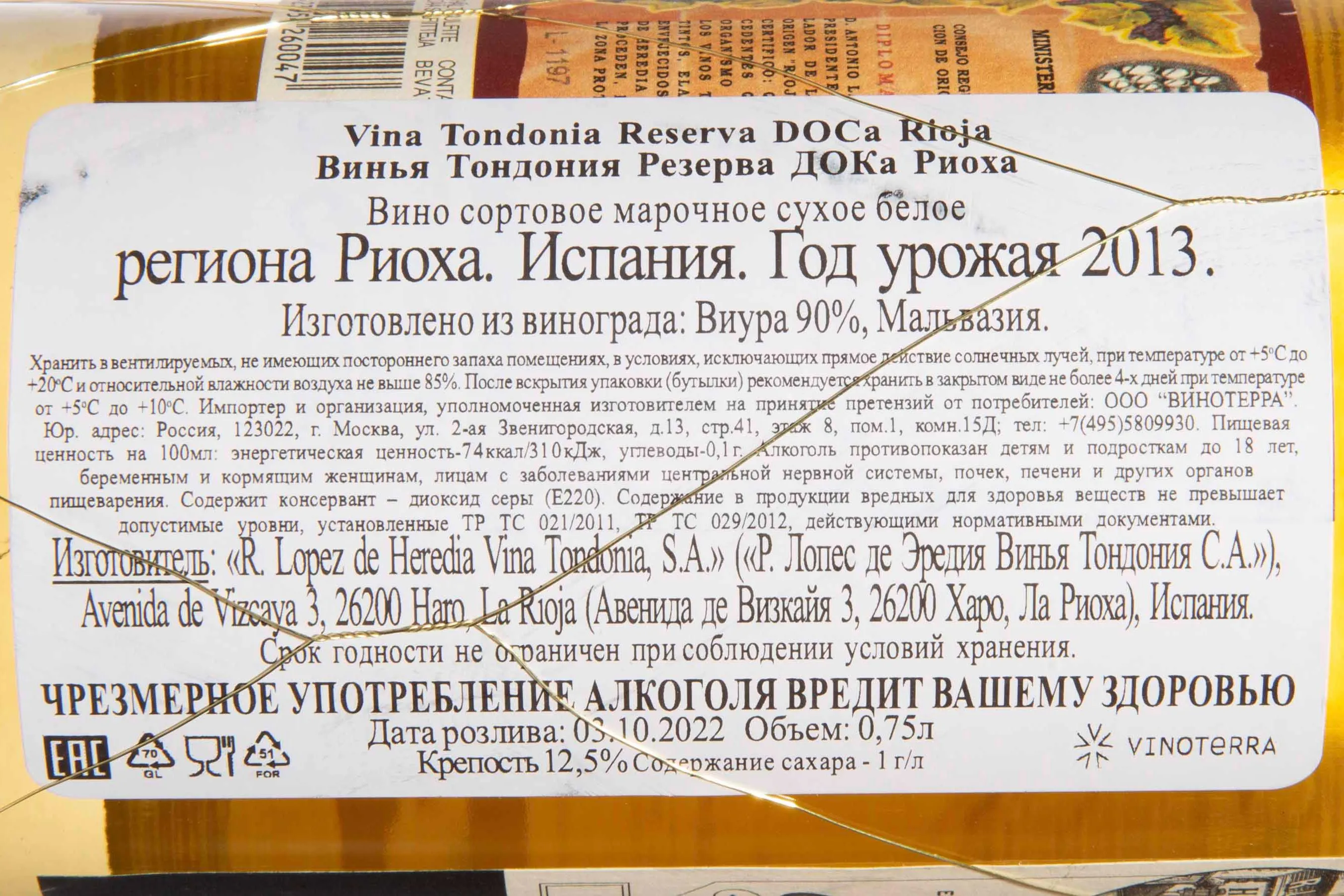 Белое сухое вино Rioja Vina Tondonia Reserva 2012 года 0,75 л — элегантное и выдержанное, с характером классической Риохи. Виноград выращен на правом берегу реки Эбро, в Rioja Alta, на аллювиально-карбонатных почвах с гравием. Сезон 2012 отмечен жаркой и сухой погодой — осадков было на 25 % меньше среднего уровня, что дало низкий, но здоровый урожай и благоприятствовало концентрации вкуса. Ферментация протекала в больших дубовых чанах, затем вино шесть лет выдерживалось в американских бочках и было разлито в бутылки без фильтрации. Оно получило около 95 баллов от ведущих критиков (Wine Advocate, Vinous, Decanter) и широкое признание как один из лучших белух образцов Reserva Rioja. Потенциал хранения 20 лет