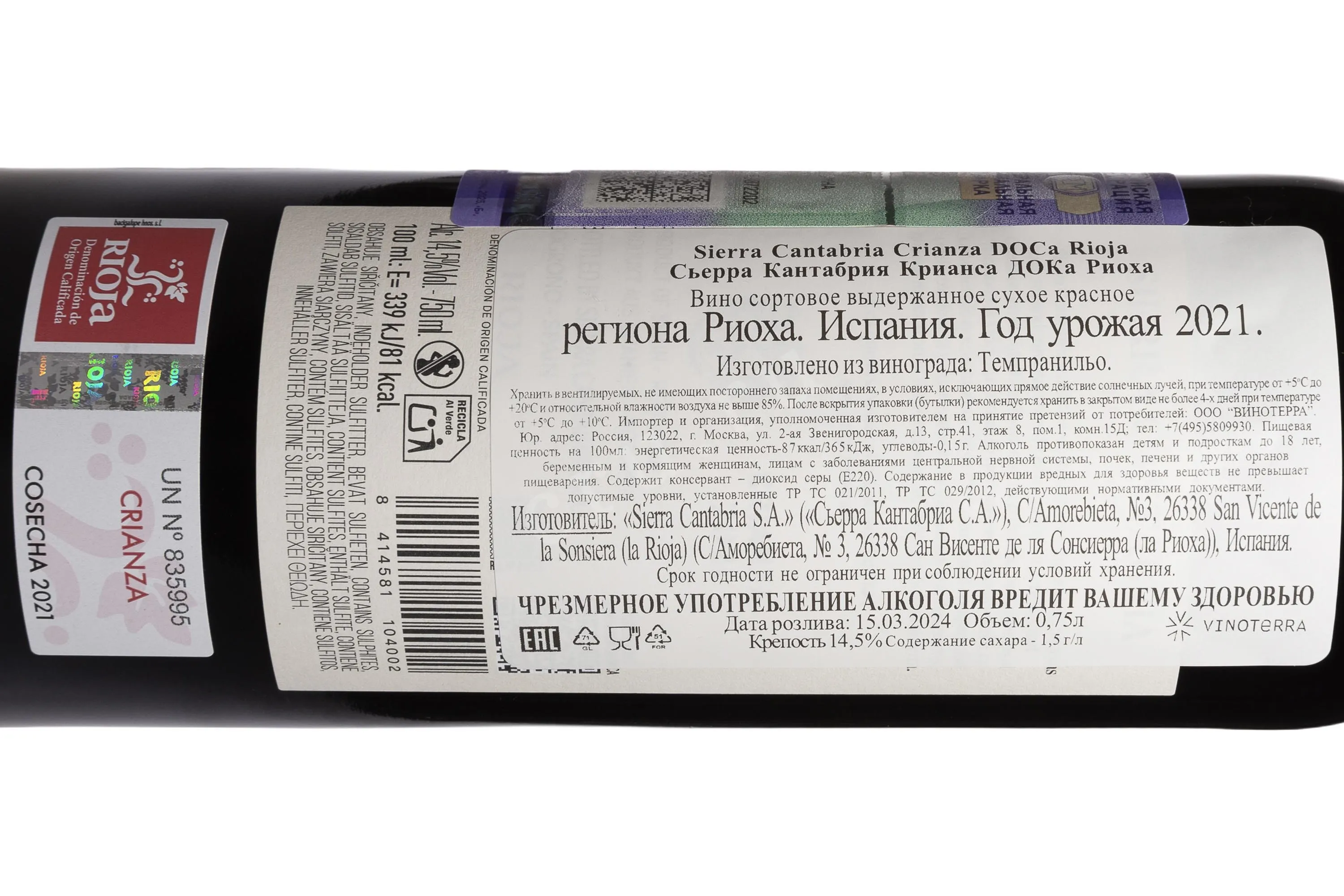 Красное сухое вино Sierra Cantabria Crianza 2021 года 0,75 л относится к классическому стилю Риохи. Оно получило высокие оценки от критиков: более 90 баллов от Wine Spectator, Robert Parker и James Suckling. Виноград для производства выращивается в терруарах Сан-Висенте-де-ла-Сонсиера и Лабастиды, где сухой климат и известково-глинистые почвы формируют яркий вкус и аромат классического испанского сорта Темпранильо. Урожай собирают вручную. Ферментация проходит при контролируемой температуре с использованием отборных местных дрожжей. Выдержка длится около 14 месяцев в бочках из французского и американского дуба, что придаёт вину глубину и сложность. Оно имеет потенциал 10 лет.